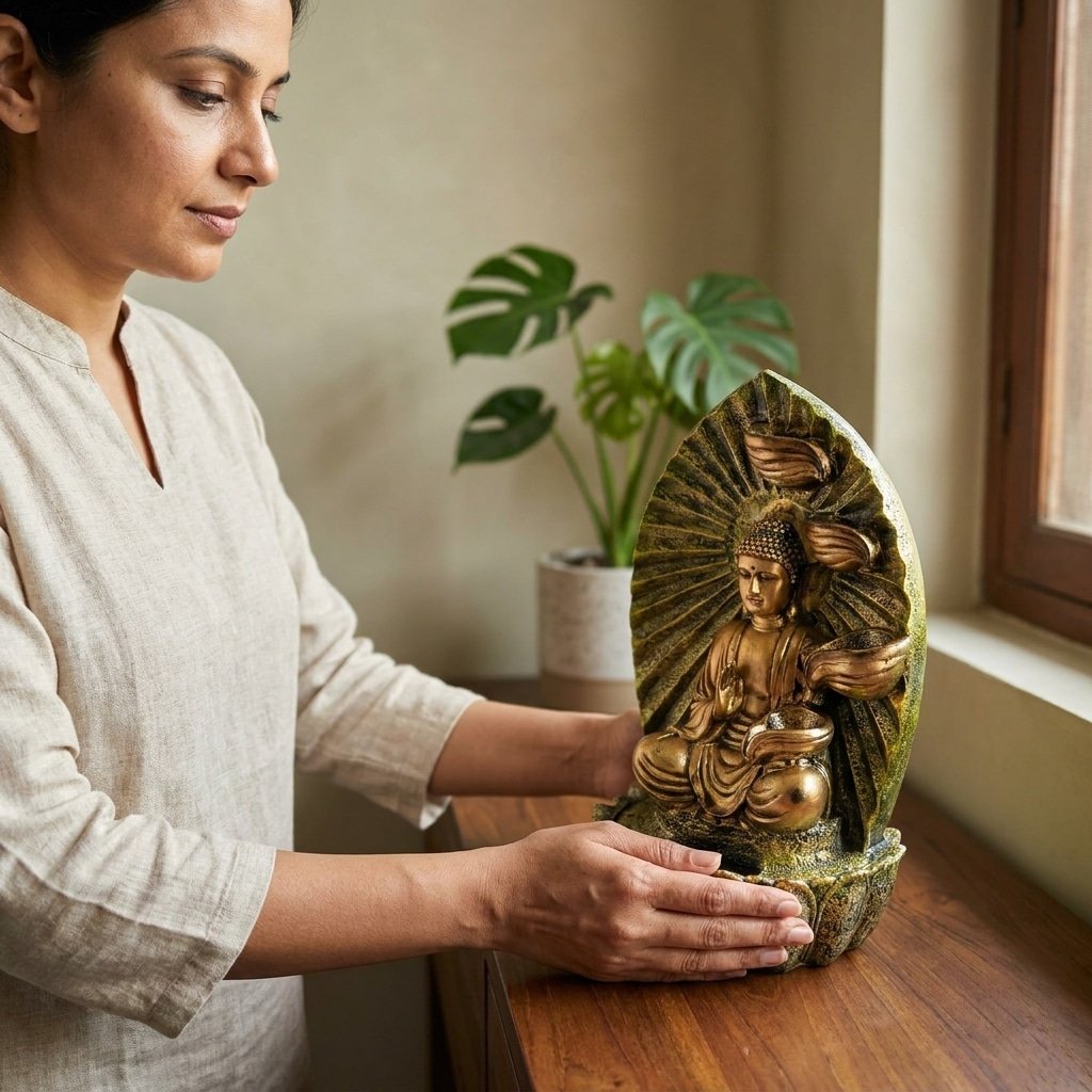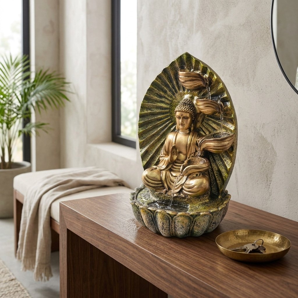 The gentle flow of water produces a calming sound that helps reduce stress, improve focus, and enhance your surroundings. Its compact size makes it ideal for desks, shelves, living rooms, offices, or prayer areas.