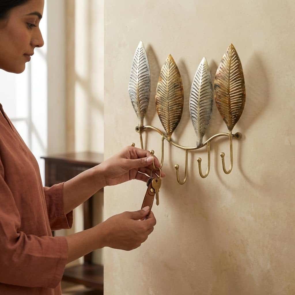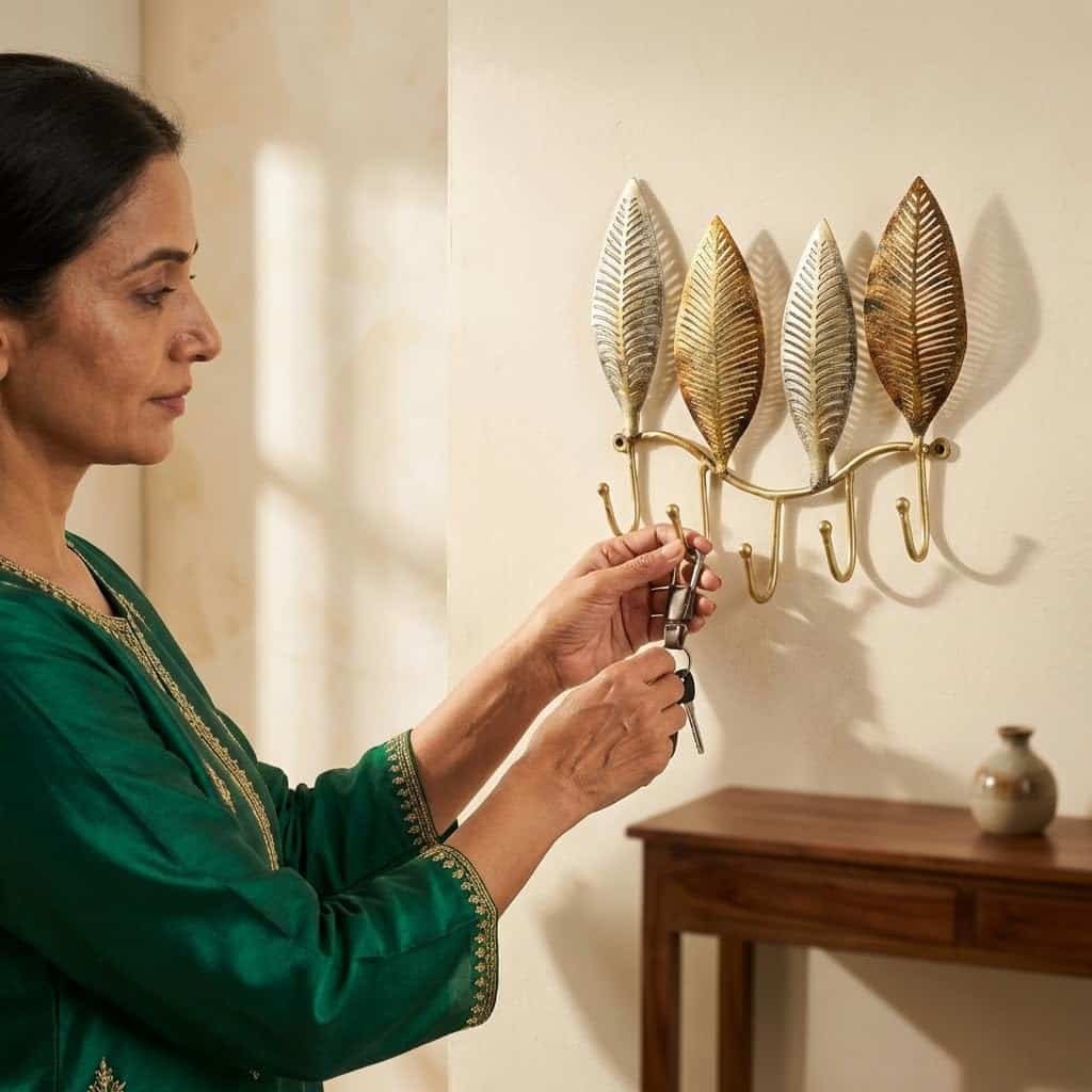 Organize your keys and accessories in style with this decorative ginkgo leaf metal key holder by Vedas Exports. This wall-mounted key holder comes with 5 strong hooks, perfect for hanging keys, kitchen utensils, towels, hats and small accessories. Ideal for entrance, kitchen, bathroom and office use, this decorative wall hook is both functional and stylish.