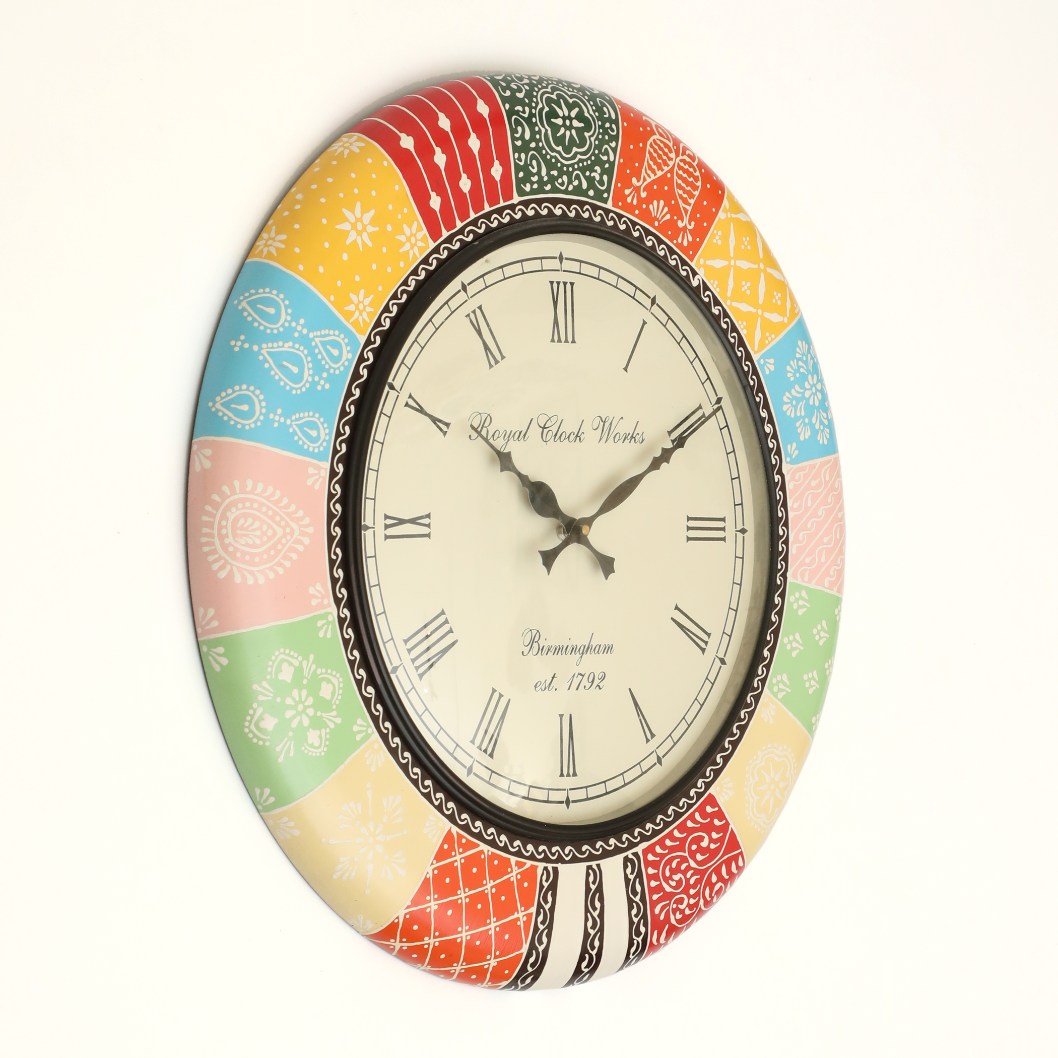 Elevate your home decor with the Galleria Handpainted Wooden Wall Clock, a stunning piece that combines functionality with artistic flair. Featuring a vibrant, colorful design on its face, this clock not only keeps time but also serves as a captivating focal point in any room. Crafted from high-quality wood and meticulously handpainted, it adds a touch of personality and charm to your space, making it an ideal choice for those who appreciate unique craftsmanship. Transform your walls and make every hour a celebration of color and creativity with this exquisite timepiece.