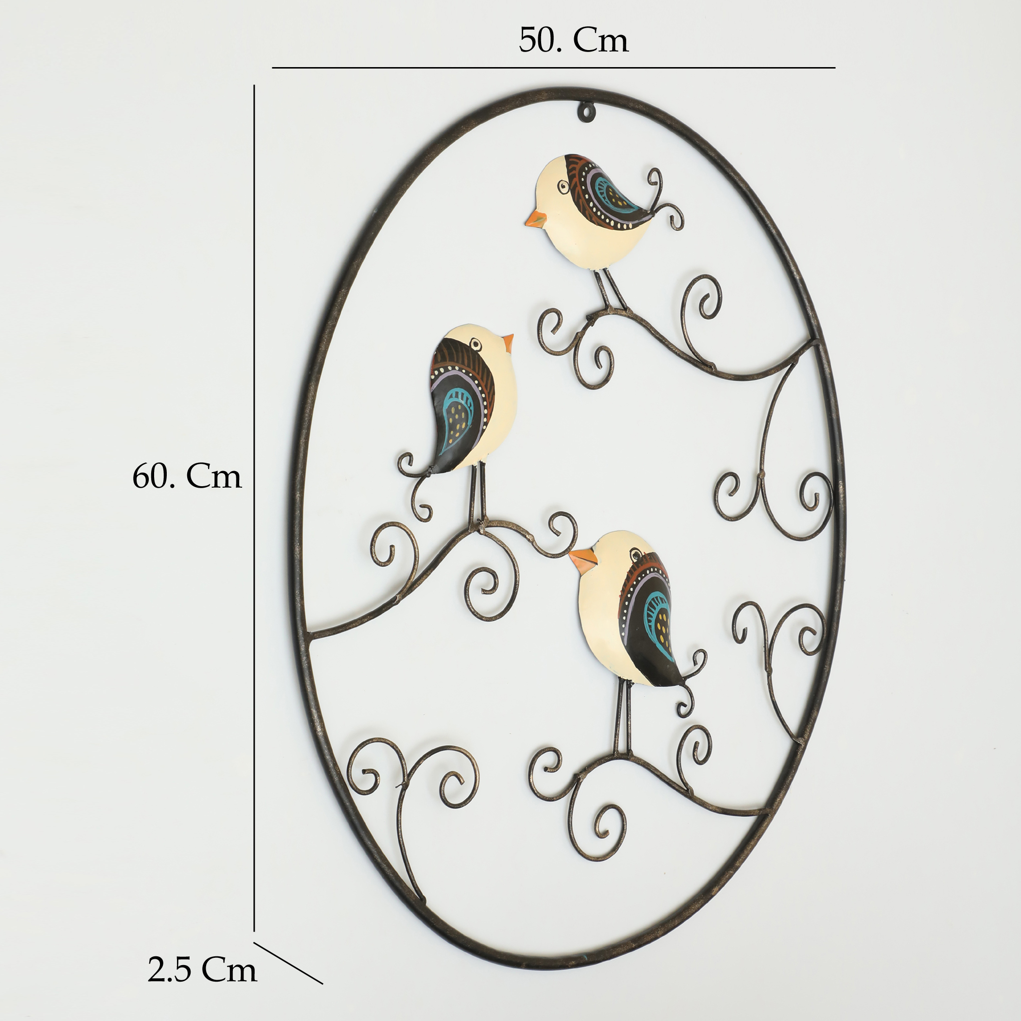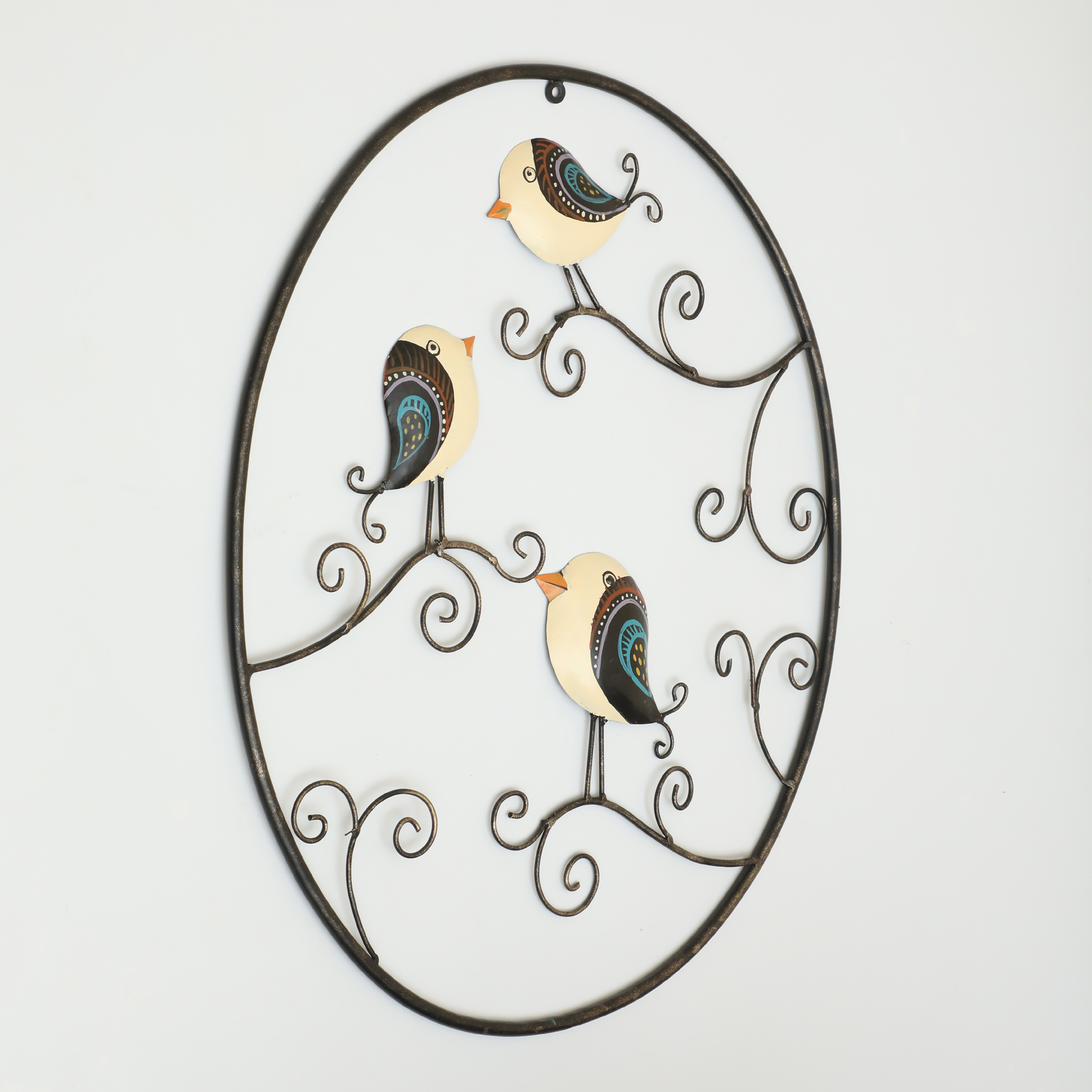 - Handpainted metal and ceramic wall decor featuring Galen birds