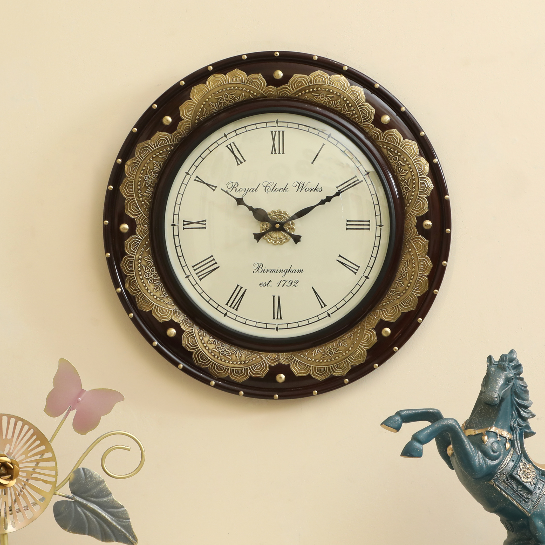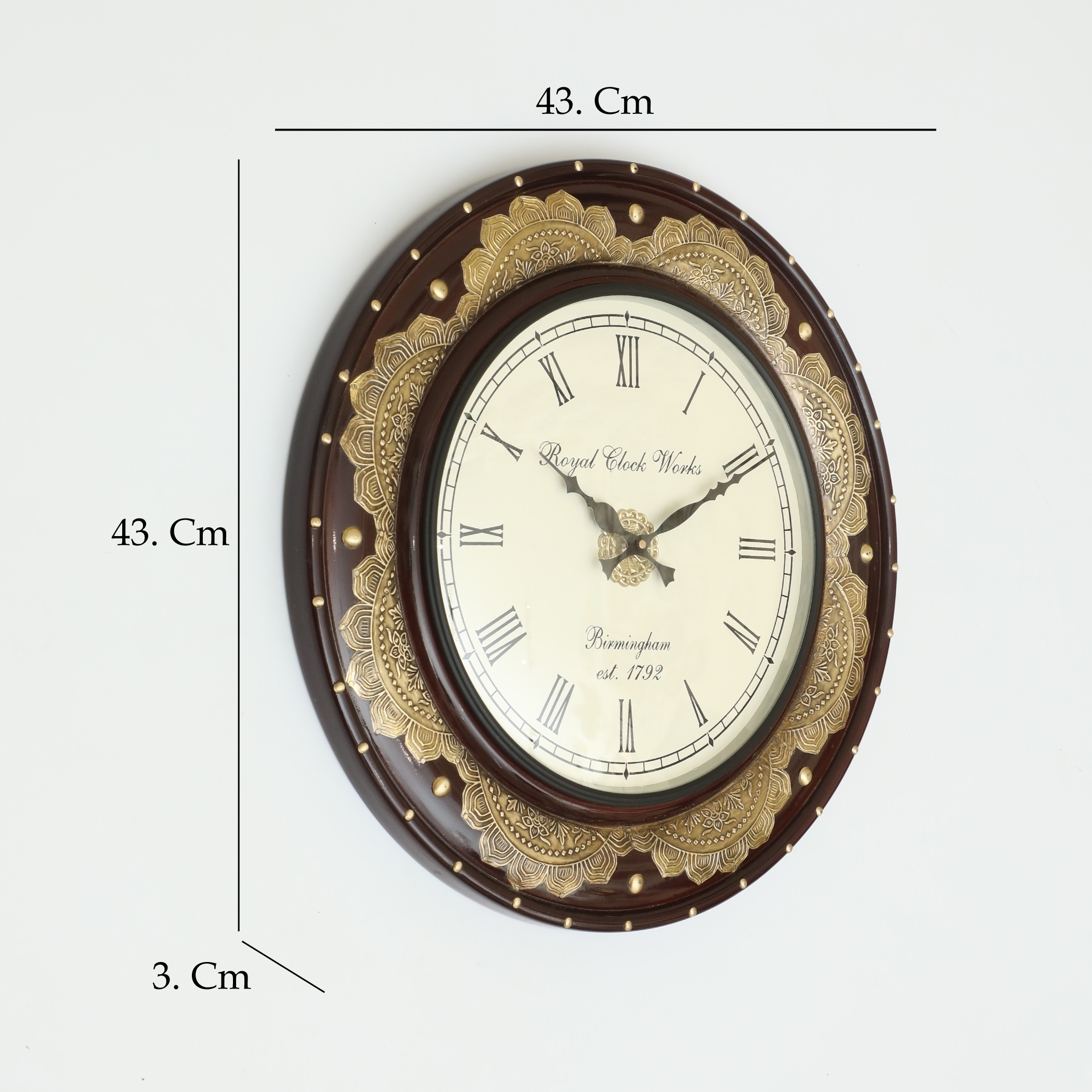 Elevate your living space with this magnificent Vedas wall clock, a stunning fusion of traditional artistry and timeless design. The 43.2 x 43.2 cm timepiece features a rich wooden frame enhanced with elegant metal detailing and decorative studs. The classic dial face showcases sophisticated Roman numerals and graceful hands, complemented by the distinguished ‘Royal Clock Works Birmingham est. 1792’ heritage styling. The cream-coloured dial, protected by clear glass, ensures excellent visibility while maintaining its decorative appeal. This battery-powered clock utilises reliable quartz movement and makes a striking statement piece, perfect for your living room, bedroom, dining area, or hallway. The contrasting dark wood frame and brass accents create a versatile aesthetic that harmonises with both contemporary and traditional décor schemes. The clock comes with pre-installed mounting hardware for straightforward installation. Its substantial construction and meticulous attention to detail make it an ideal choice for those seeking to add a touch of sophistication to their home décor. The clock requires one AA battery (not included) for operation and is designed specifically for indoor use.
