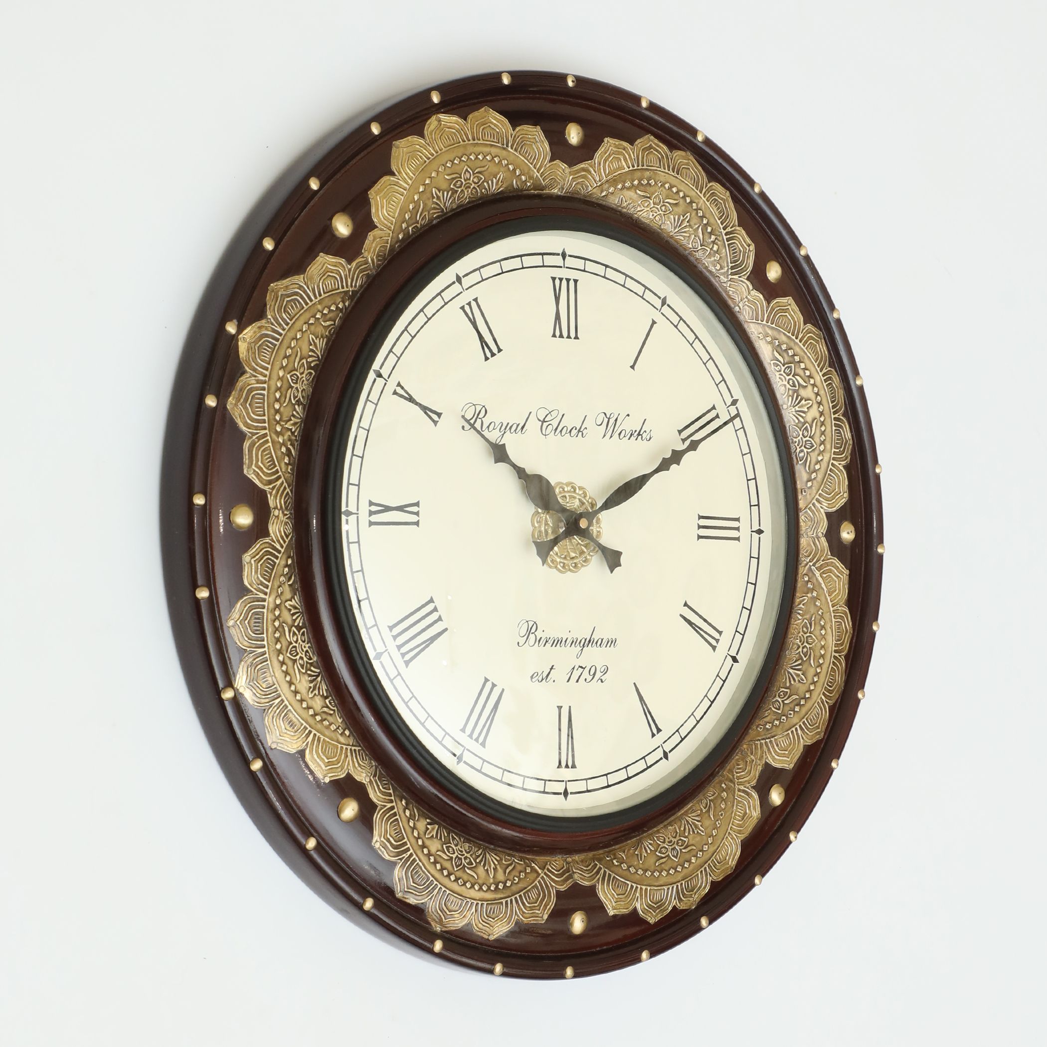 - ELEGANT DESIGN: Classic wall clock featuring wooden frame with brass detailing, decorative studs, and traditional Roman numerals on a cream-coloured dial face