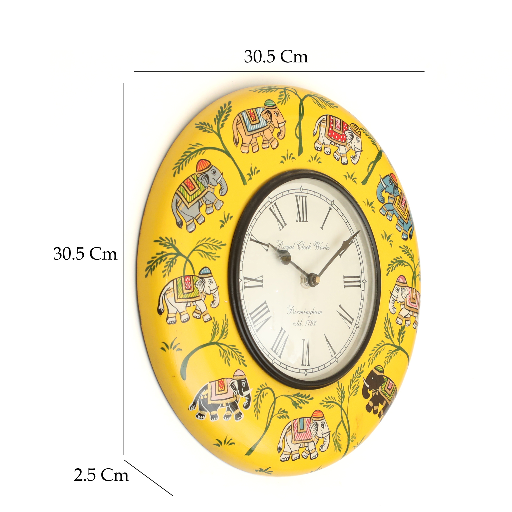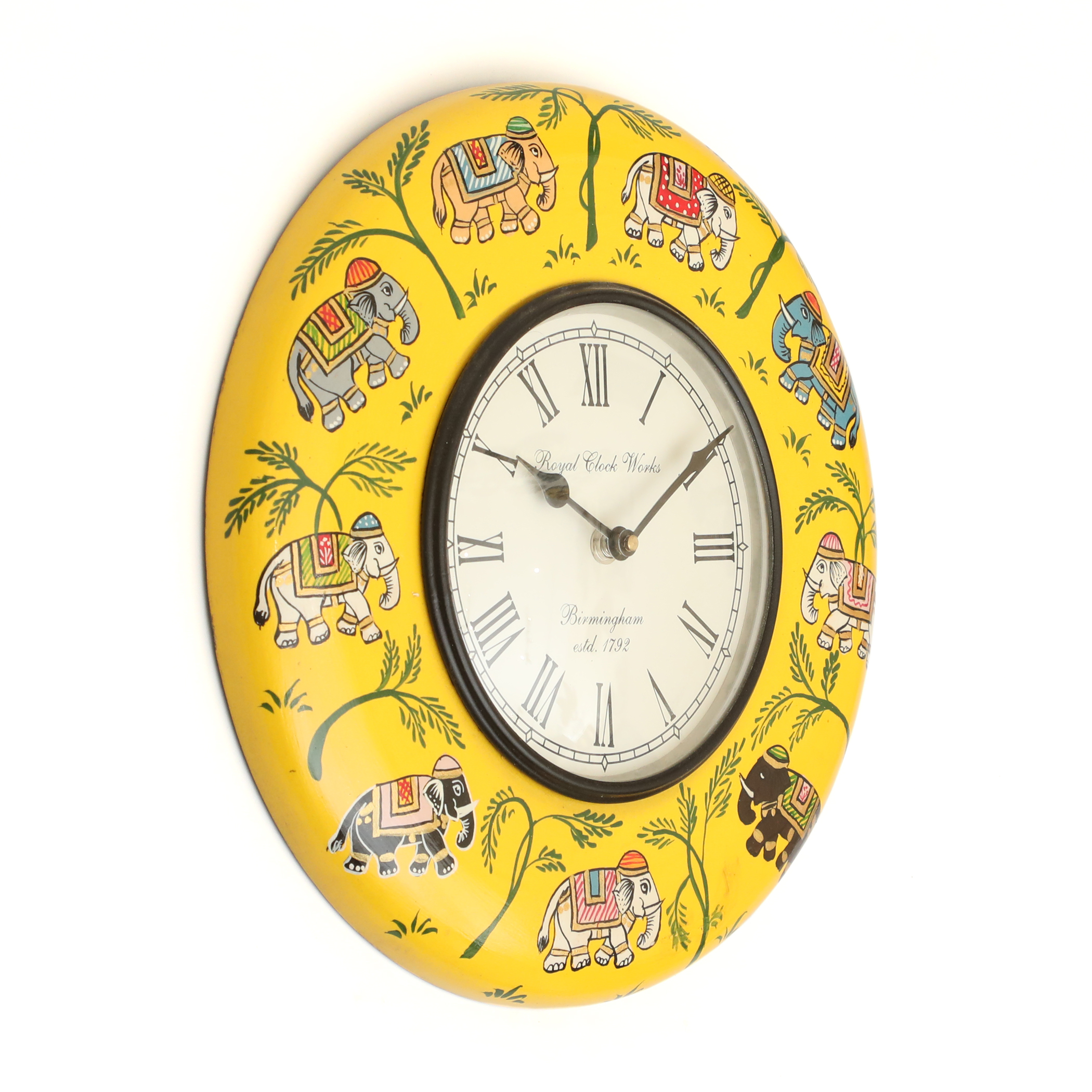 Elevate your home decor with the Mason Handpainted Wooden Wall Clock, a stunning piece that combines functionality with artistic flair. Featuring a vibrant yellow backdrop adorned with charming elephants and palm trees, this clock brings a touch of the exotic to any room. Handcrafted with care, its unique design not only keeps you on time but also serves as a captivating conversation starter. Perfect for those who appreciate craftsmanship and a playful aesthetic, this wall clock is an ideal addition to your living space or a thoughtful gift for loved ones.