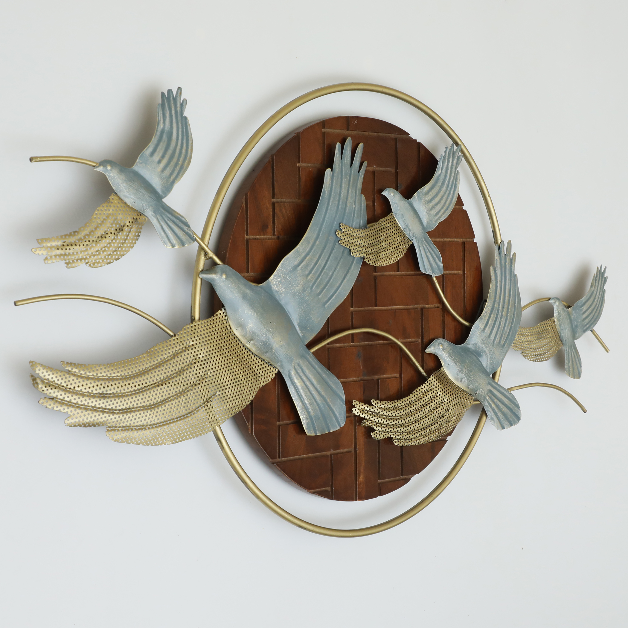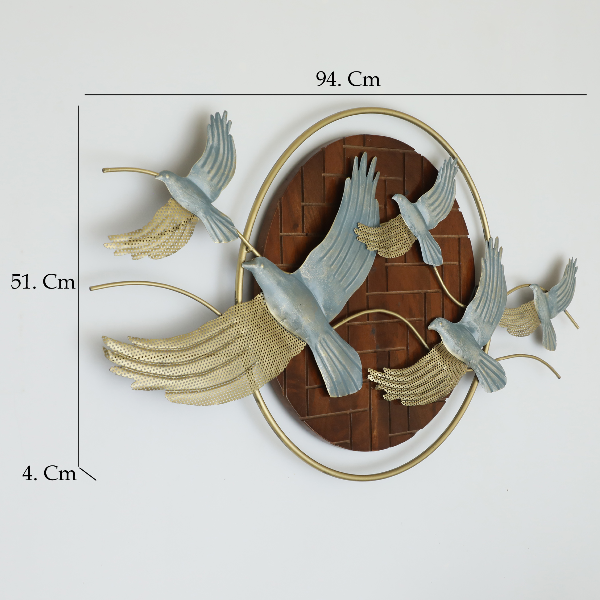 - ELEGANT DESIGN: Features five gracefully flying birds with metallic blue finish and golden mesh wings, arranged around a circular wooden frame