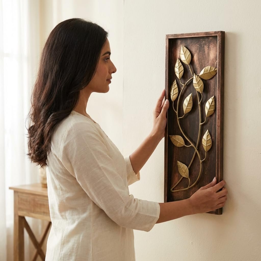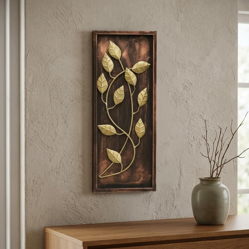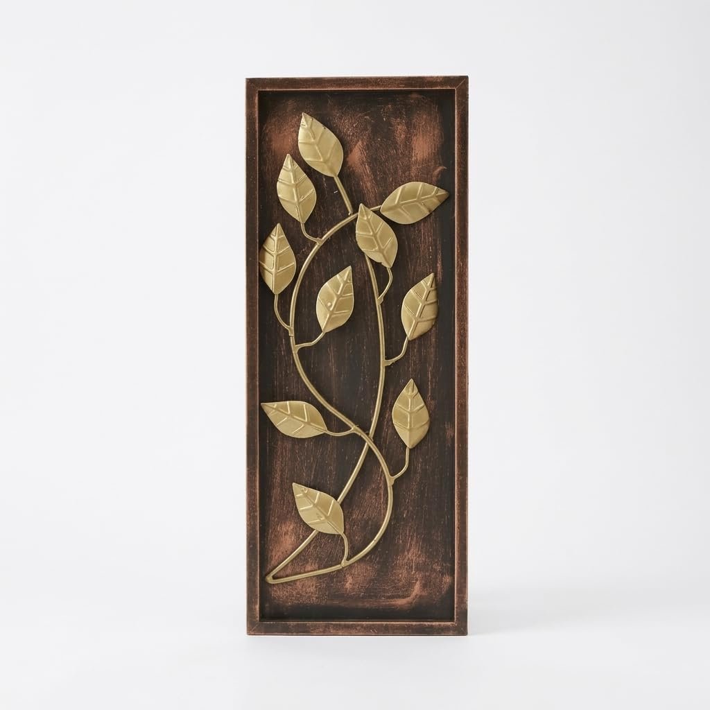 - DESIGN ELEMENTS: Features elegant gold-toned metal leaves arranged in a graceful vine pattern against a rich brown wooden background