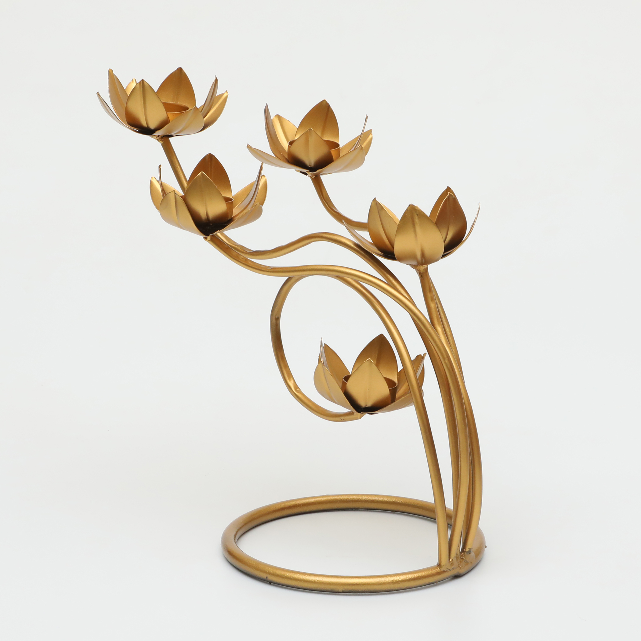- ELEGANT DESIGN: Beautiful gold-finished metal lotus flower candle holder with 5 artistically arranged blooms on gracefully curved stems