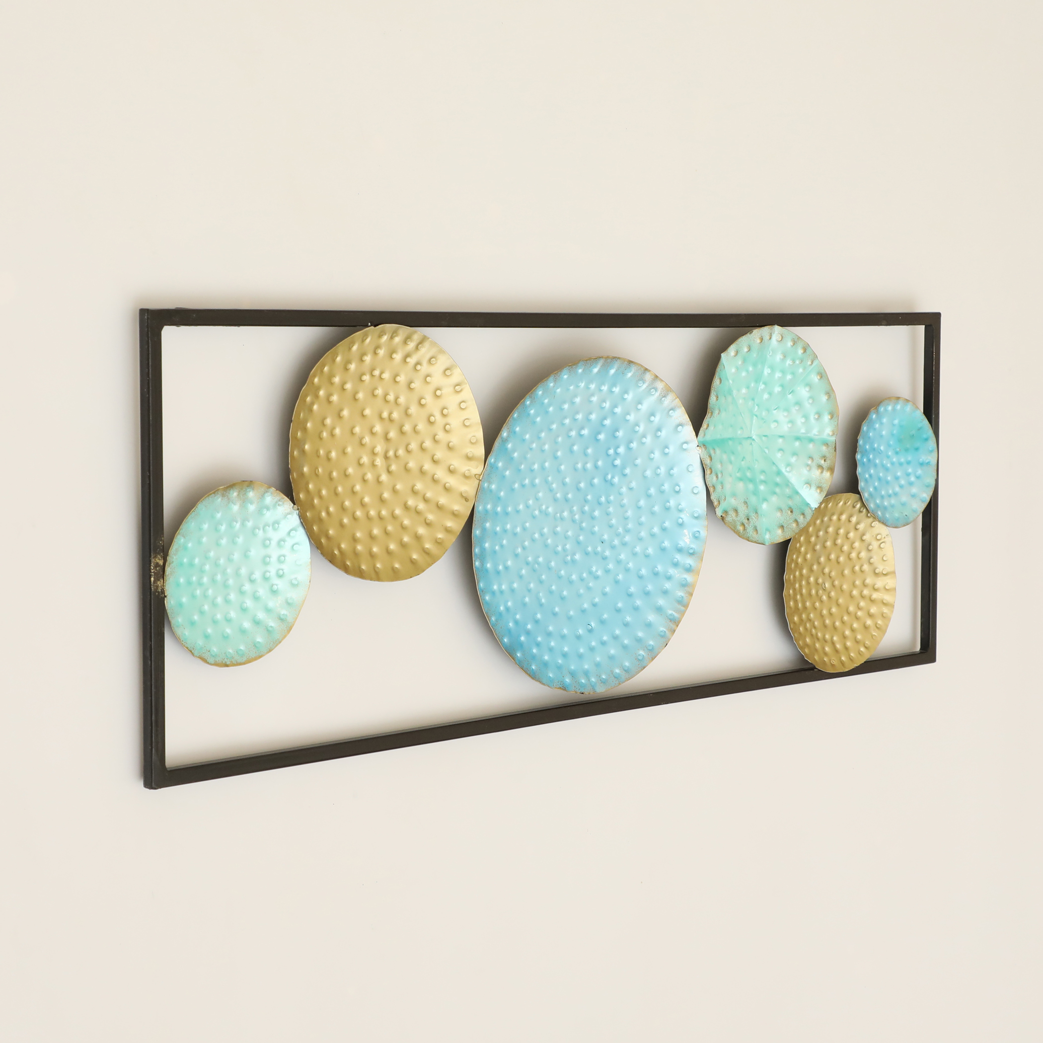 - Artistic Design: This metal wall art sculpture features a rectangular frame with multicoloured circular discs in varying sizes, creating an eye-catching and modern decor piece.