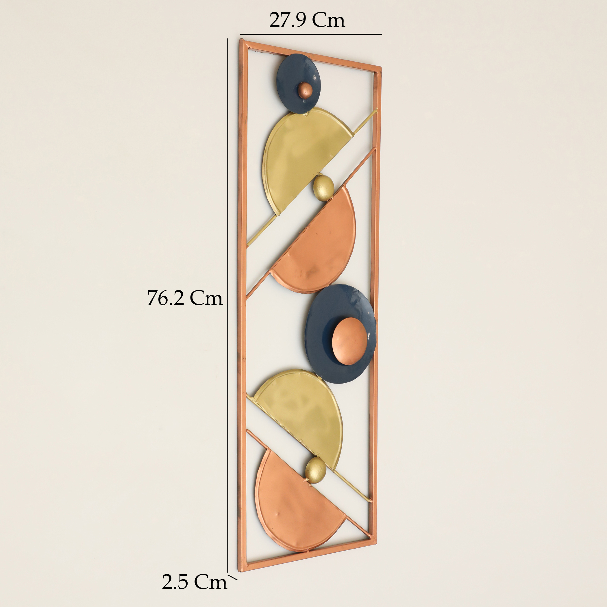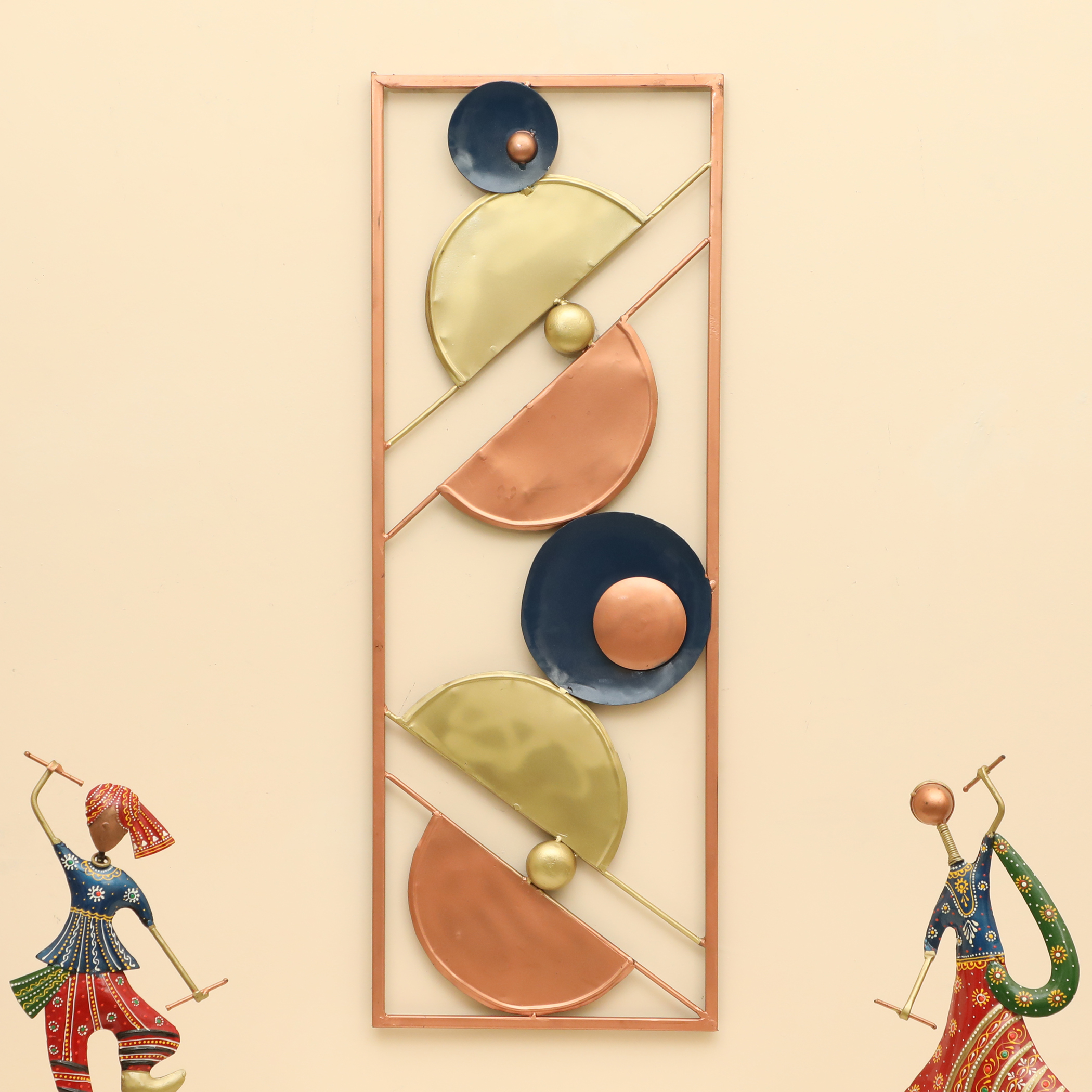 - Artistic Design: Rectangular metal wall sculpture with abstract geometric shapes in multicolours like navy blue, mustard yellow, and rose pink.