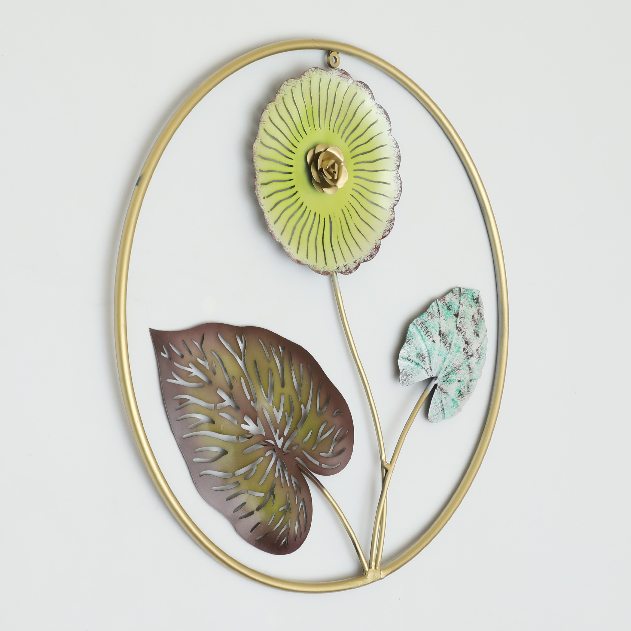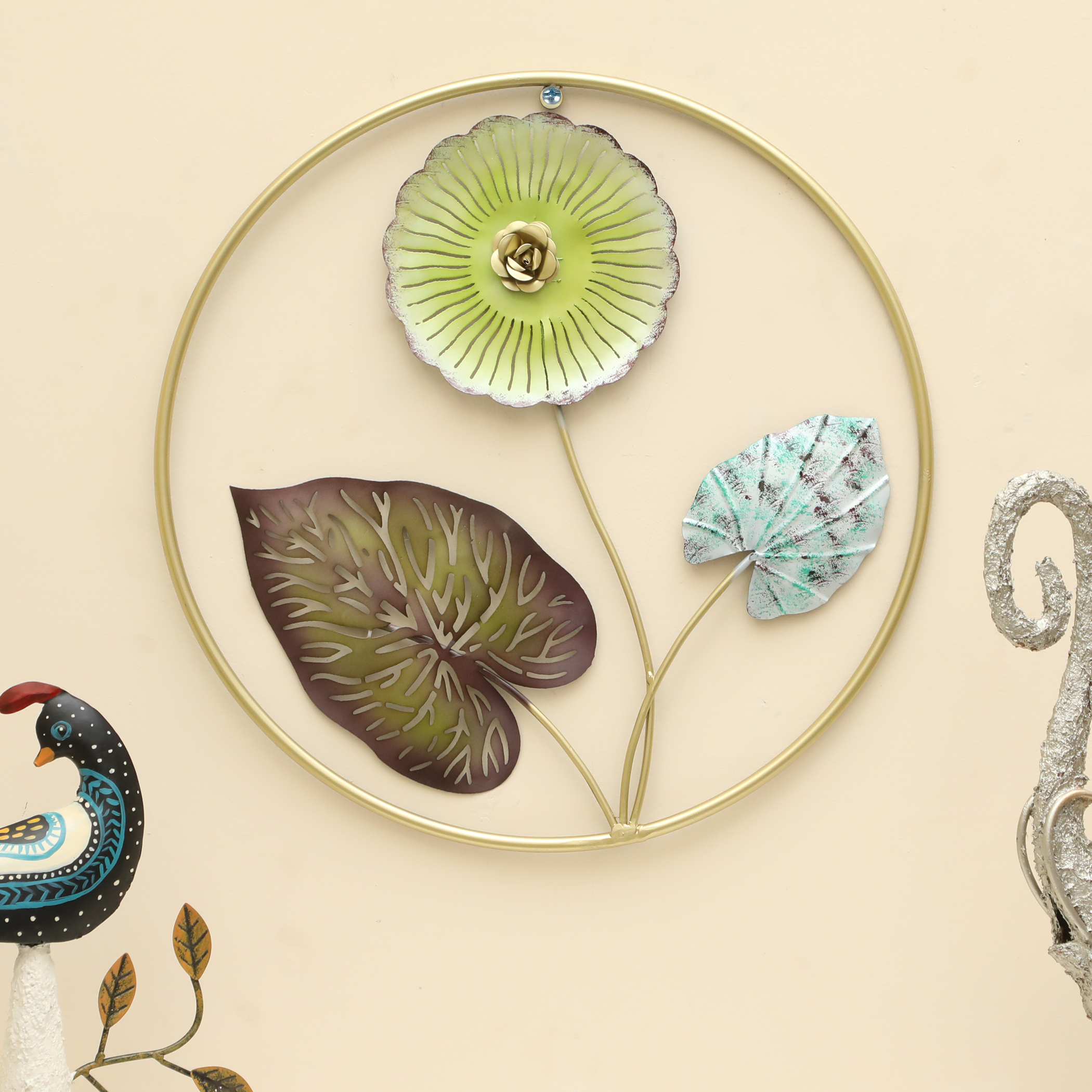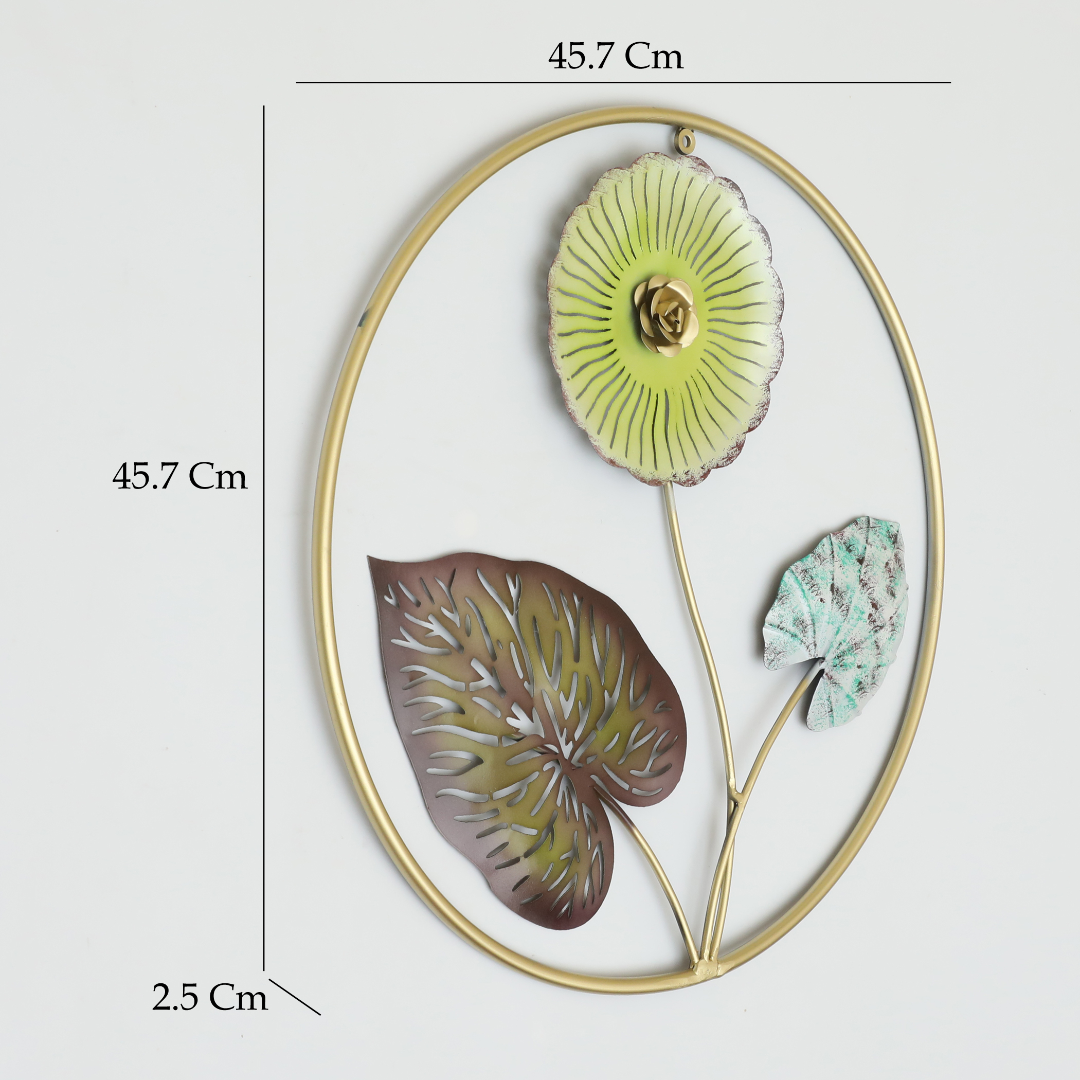 - Striking Design: Vedas metal round leaf wall frame exudes rustic charm with its multicolour finish.