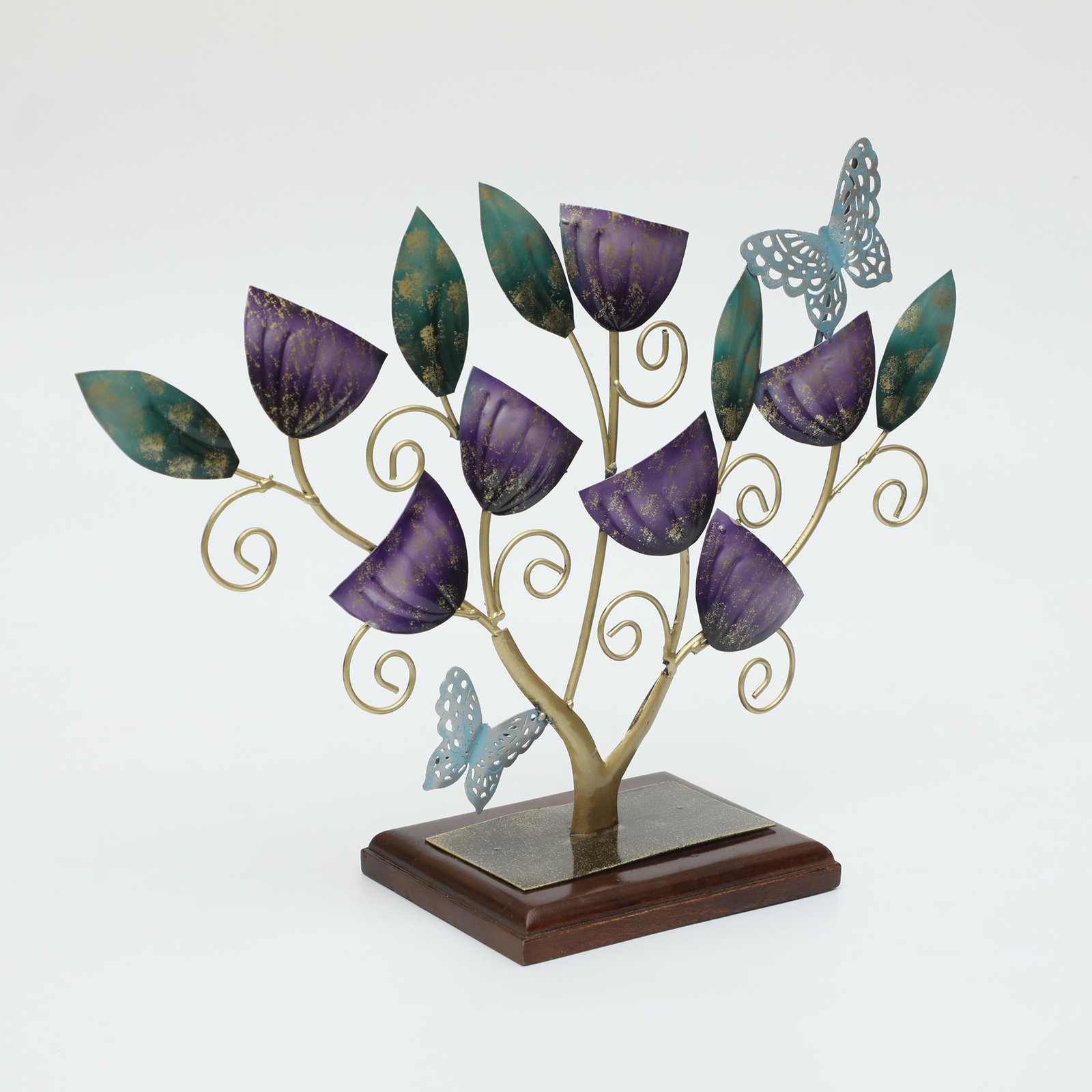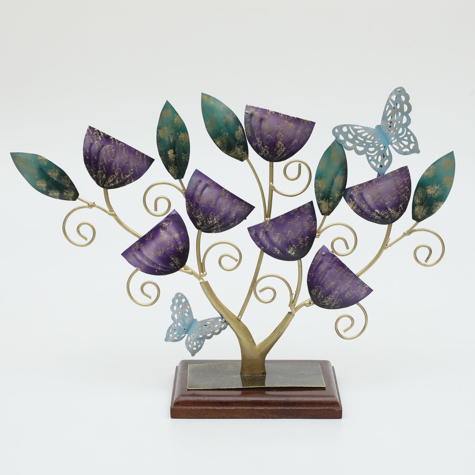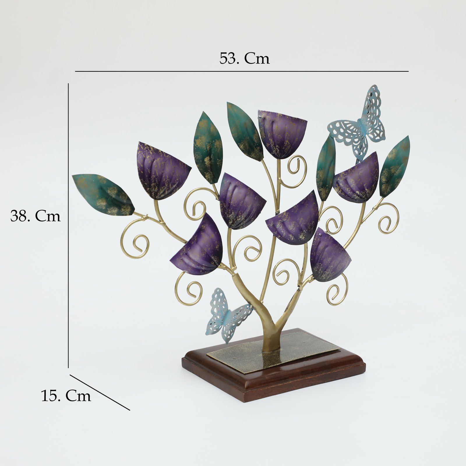 Transform your living space with this enchanting Alison Leaf with Butterfly table decor showpiece. This artistic masterpiece features a harmonious blend of purple tulip-shaped flowers and teal leaves arranged on elegant golden swirling branches, complemented by delicate blue butterflies. Standing at an impressive 53.3 x 38.1 centimetres, this decorative piece is crafted from durable metal and sits atop a refined wooden base. The distressed, vintage-inspired finish adds character to each element, from the metallic accents to the weathered patina on the leaves and flowers. Perfect as a centrepiece for your living room, home office, or hotel lobby, this versatile showpiece adds a touch of whimsy and sophistication to any setting. Its unique design makes it an ideal gift choice for those who appreciate distinctive home decor that combines natural elements with artistic flair.