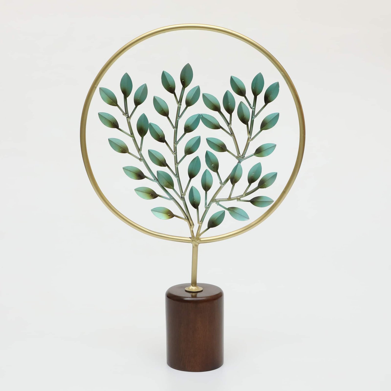 Transform your living space with this exquisite Bryan Tree Table Decor showpiece, a perfect blend of artistry and elegance. Standing at an impressive 55.88 cm in height and 35.56 cm in width, this decorative piece features a mesmerising circular design with delicate turquoise leaves arranged in a symmetrical pattern. The metallic golden frame is perfectly balanced on a rich wooden base, creating a harmonious fusion of materials. The contemporary tree design symbolises growth and vitality, making it an ideal centrepiece for your living room, home office, or hotel lobby. Each leaf is meticulously crafted with attention to detail, catching light beautifully to create subtle shadows and depth. This versatile decor piece complements various interior styles, from modern minimalist to traditional settings. Whether displayed on a console table, shelf, or as a standalone piece, this sophisticated showpiece adds a touch of natural beauty and refinement to any space.