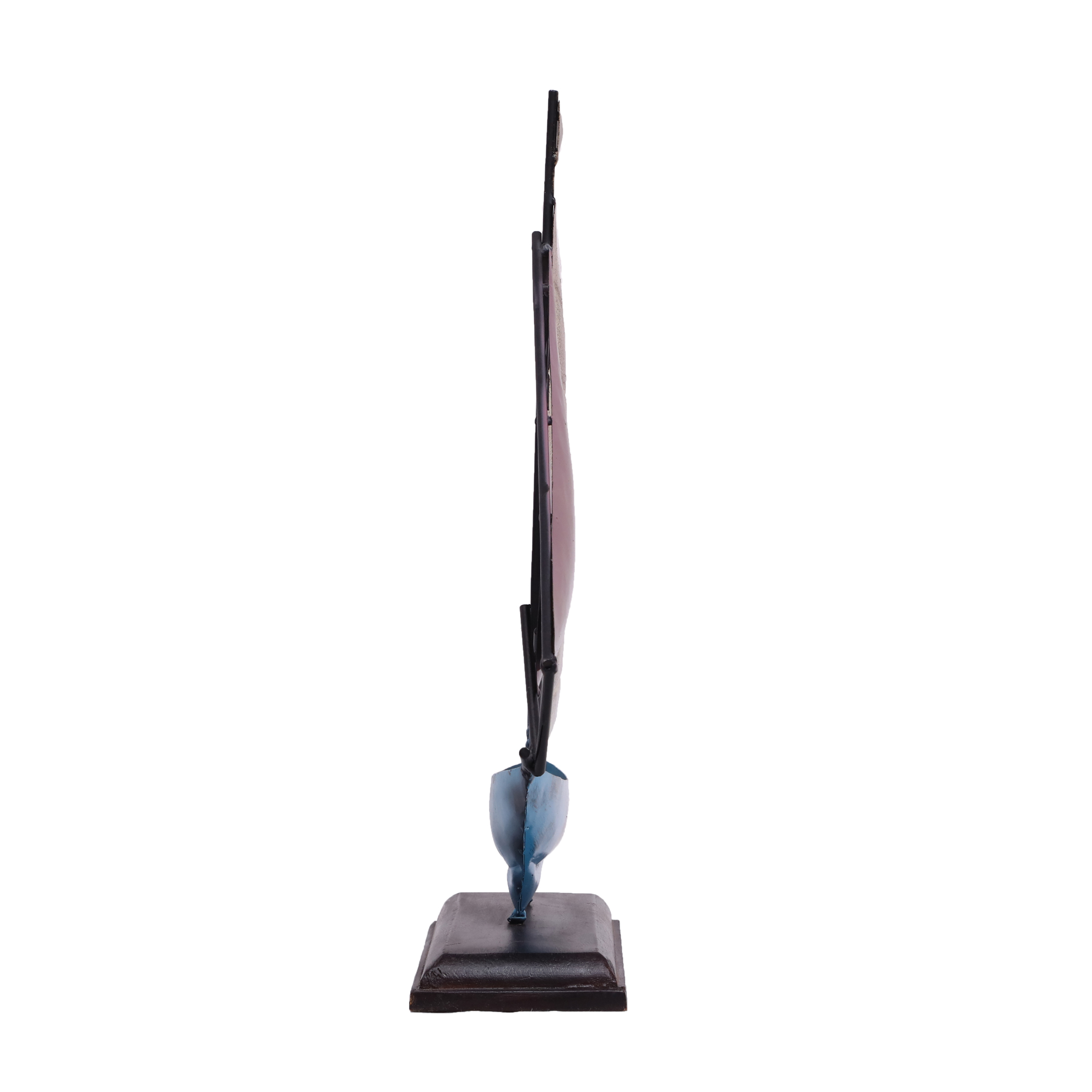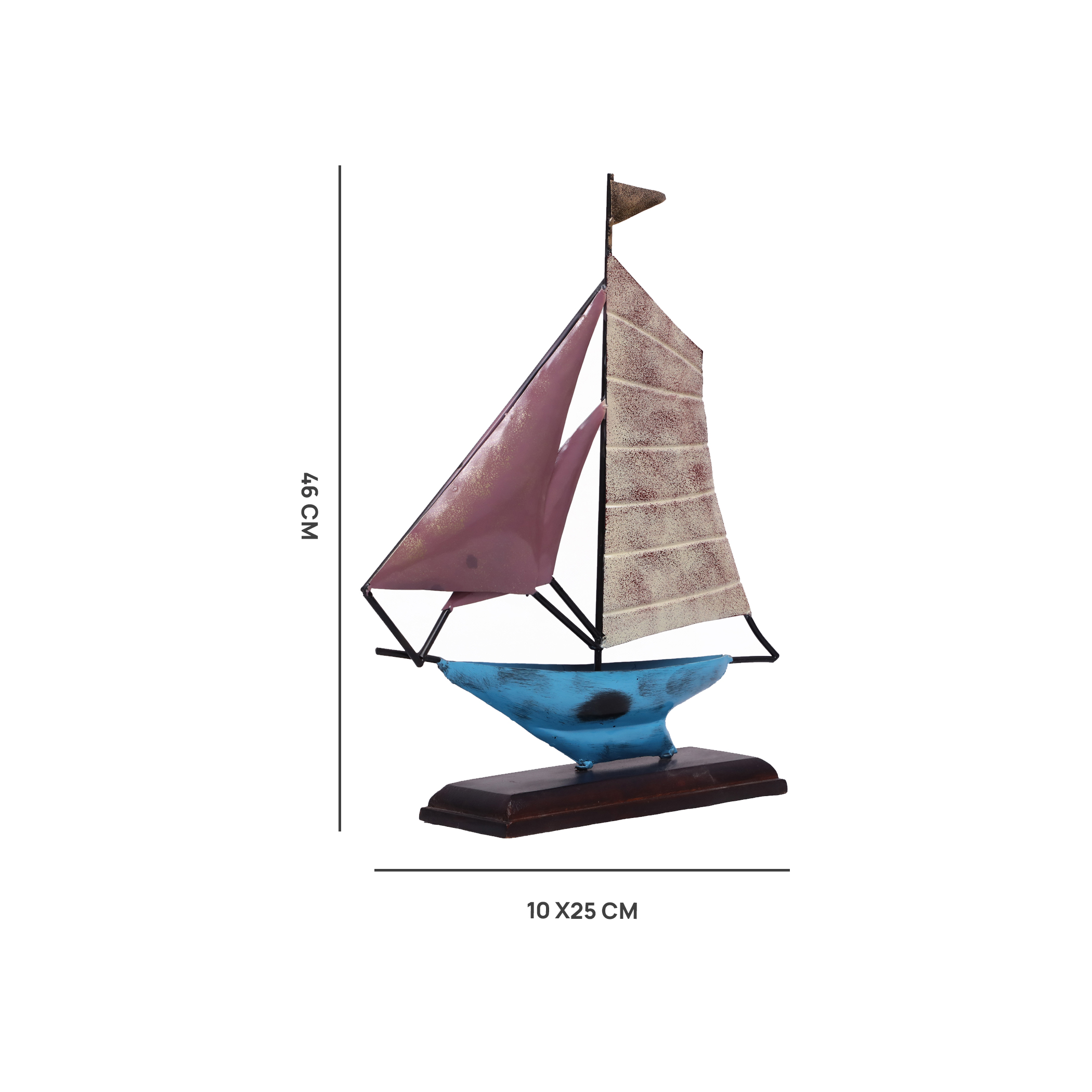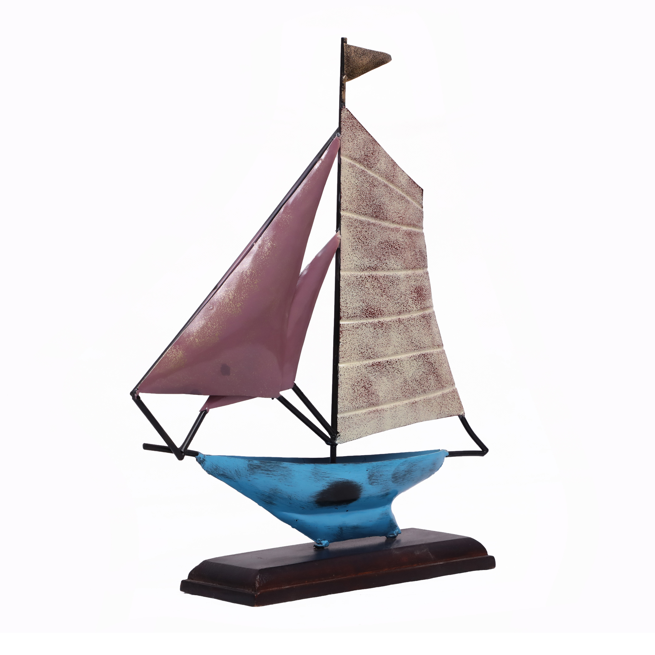 - PREMIUM CRAFTSMANSHIP: Handcrafted metal and wood sailboat table decor showpiece with multicolored design featuring blue hull, pink and striped sails, and wooden base for elegant display