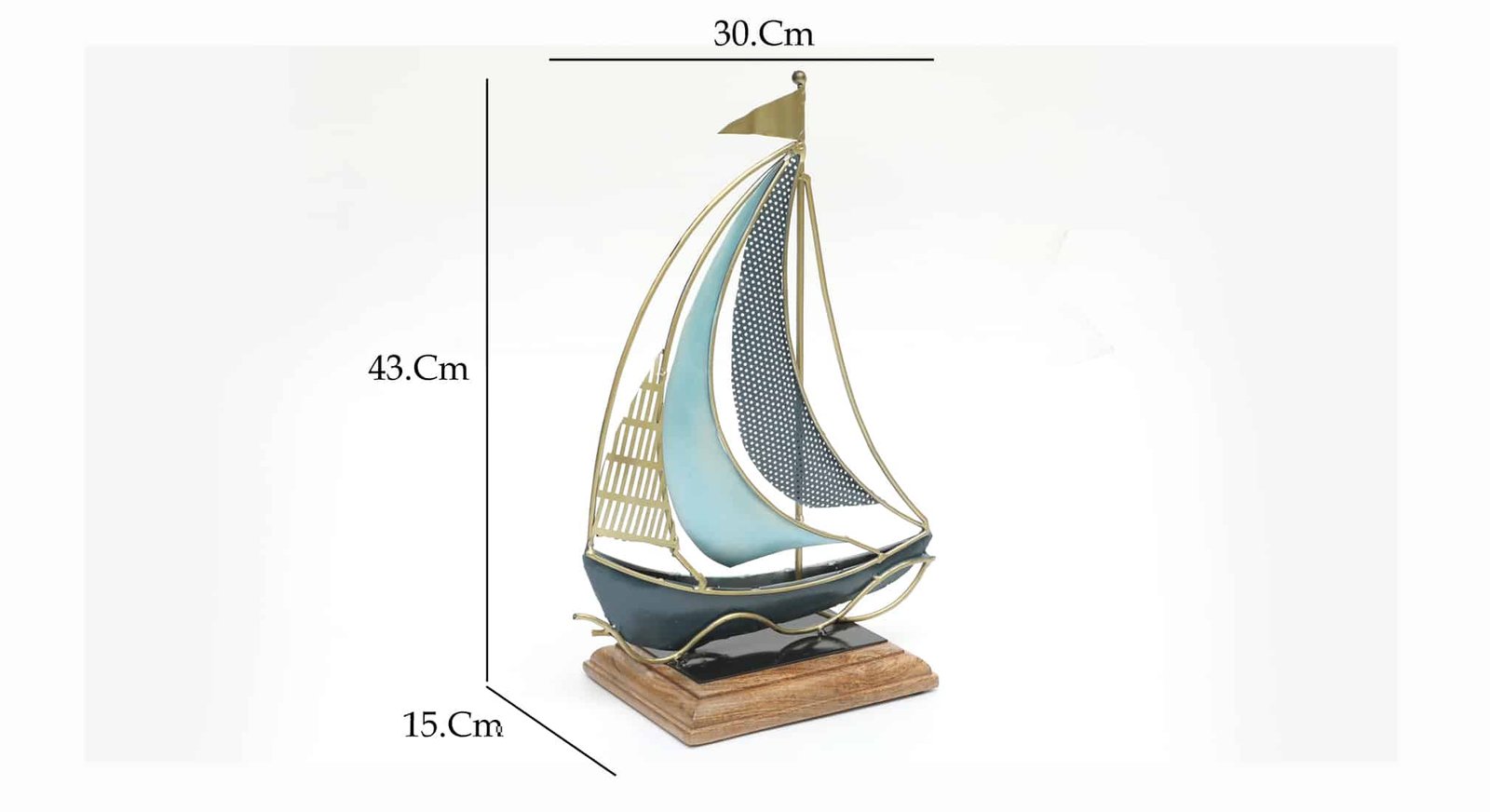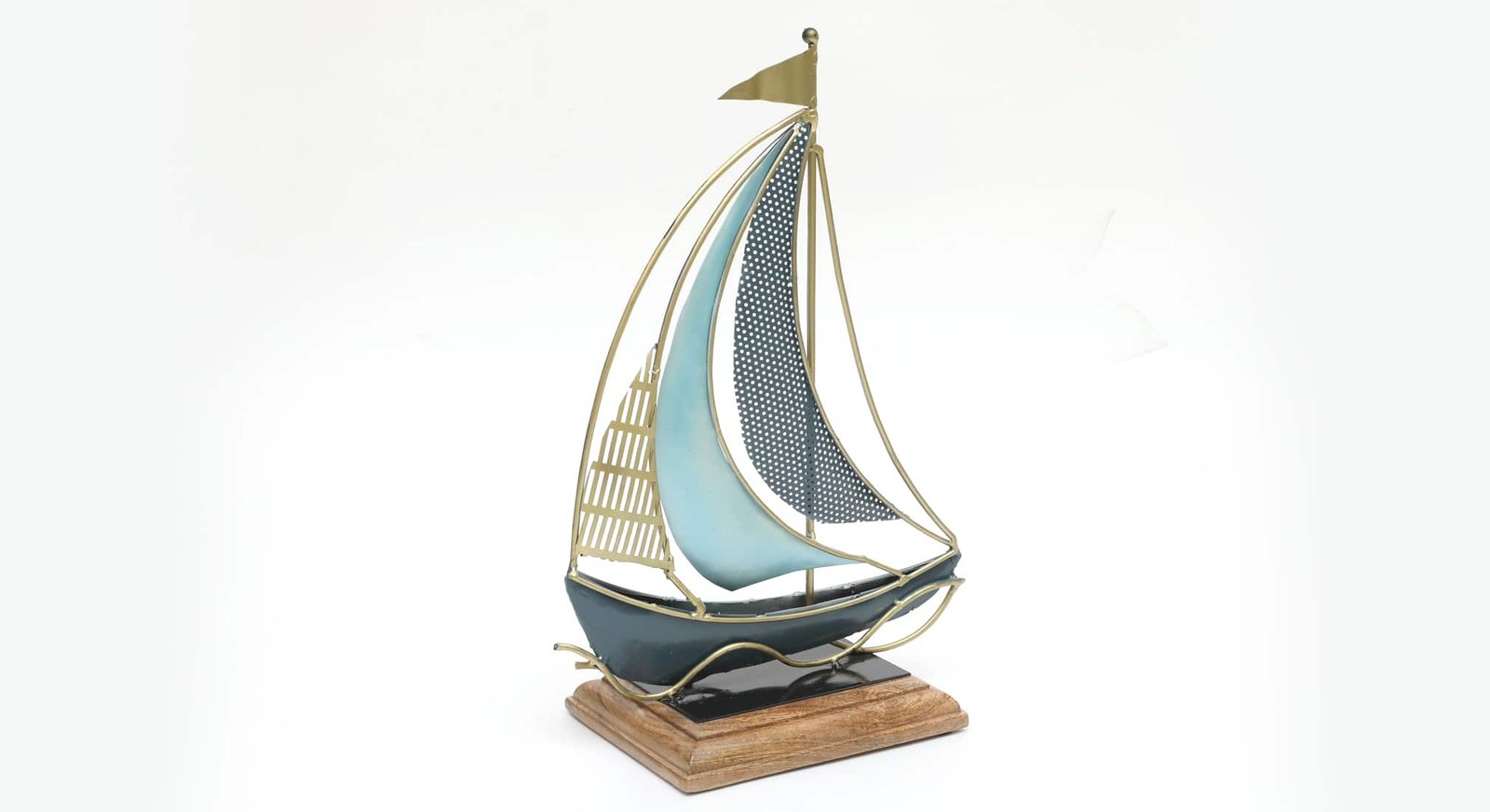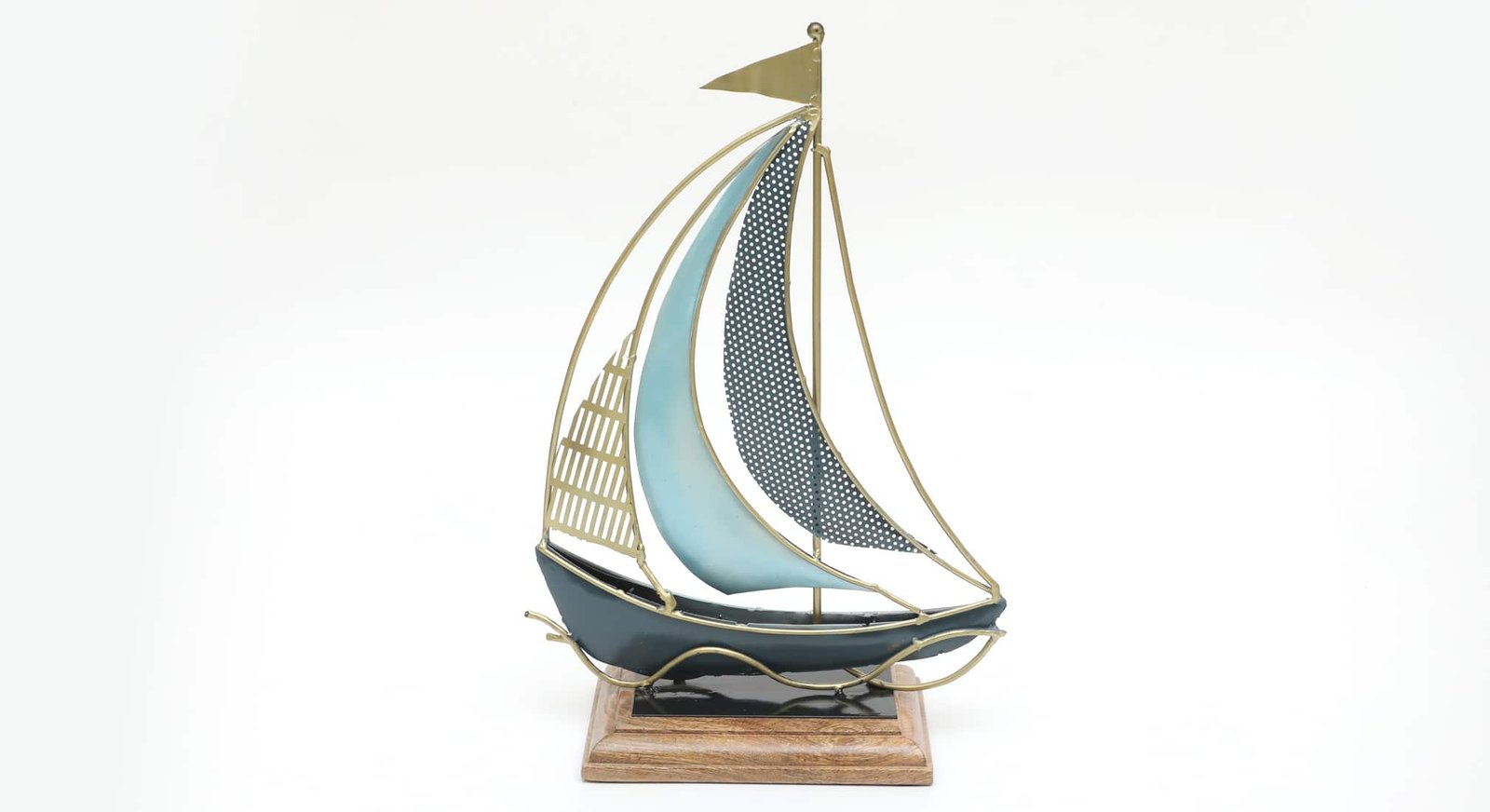 - Exquisite Design: This multicolour metal and wood boat ship model figurine features an intricate design with sails in navy blue, white, and teal hues along with a golden mast and hull.