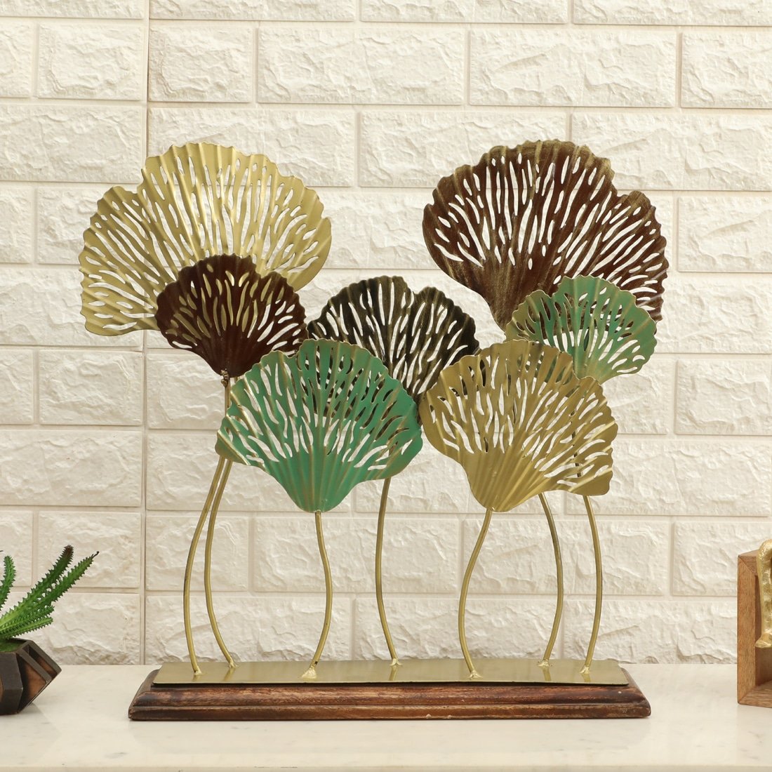 - Artistic Design: This decorative showpiece features a set of seven stylised ginkgo leaves in varying shades of green, brown, and gold, adding a touch of natural elegance to any living space.