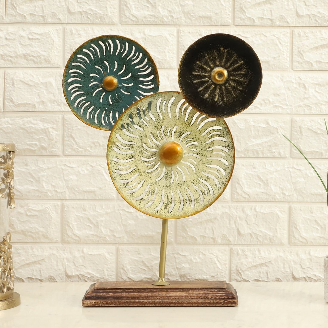Add a touch of elegance to your living space with this stunning metal and wood decor sculpture. Crafted with meticulous attention to detail, this piece features three circular discs in a vibrant multicolour finish, each adorned with intricate patterns and a golden centre. Mounted on a sturdy wooden base, this sculpture exudes a sense of sophistication and artistry. Measuring 12 x 17 inches, it makes a captivating centrepiece for your coffee table, console, or mantelpiece. Whether you’re seeking to enhance your home’s aesthetic or impress guests with your refined taste, this decor sculpture is a must-have addition to your collection. Elevate your interior design with this exquisite blend of form and function.