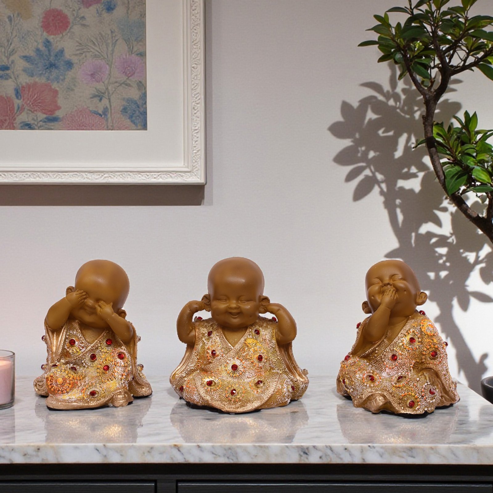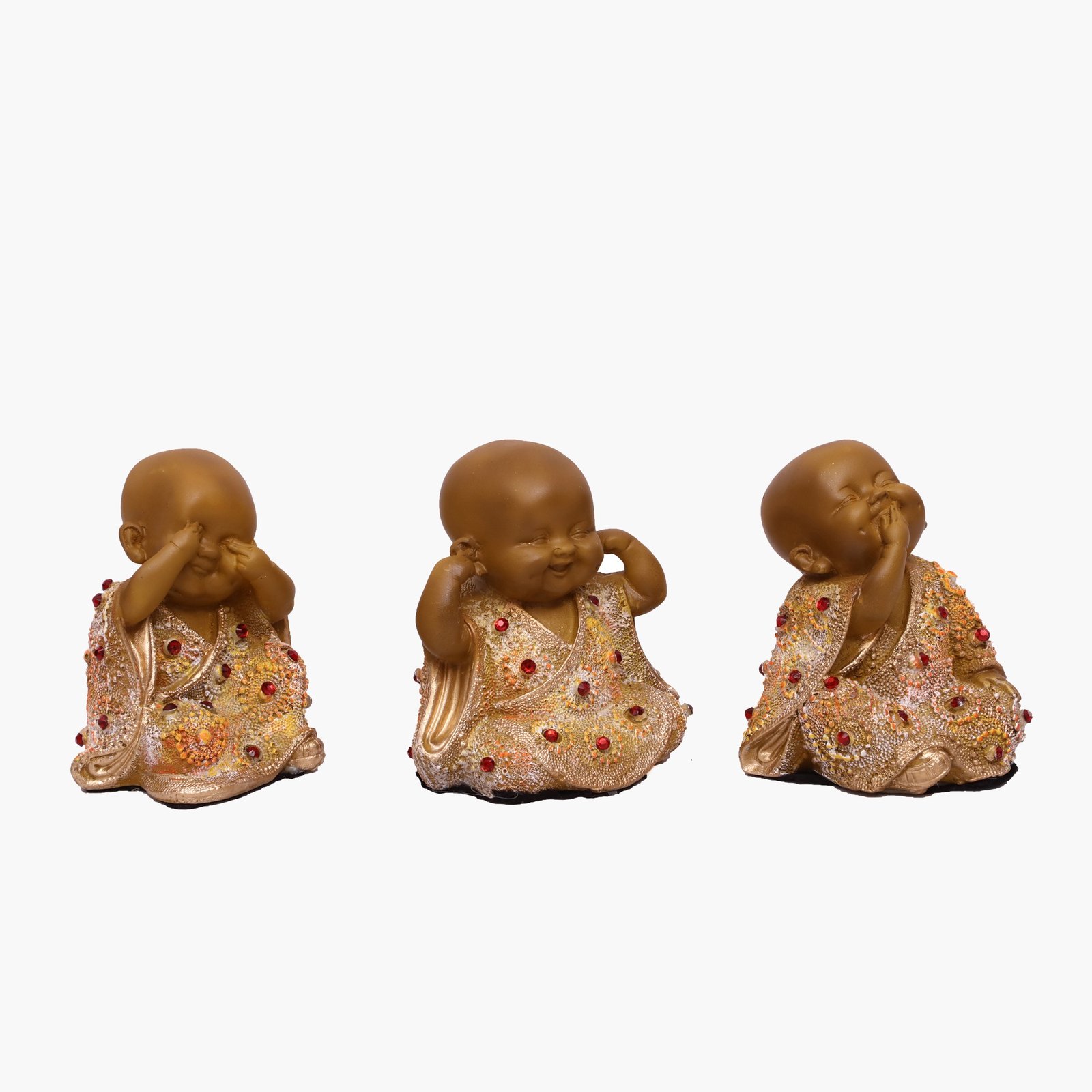 Polyresin Small Monk Bacha Set Figurine Showpiece Table Decor (Set of 3) (Yellow)