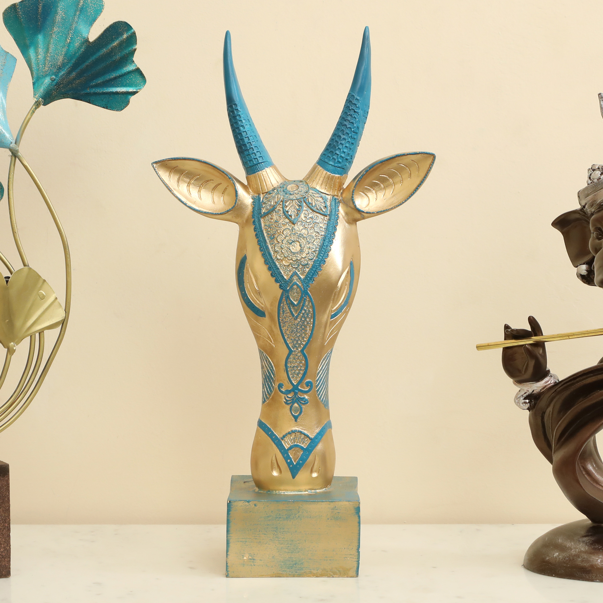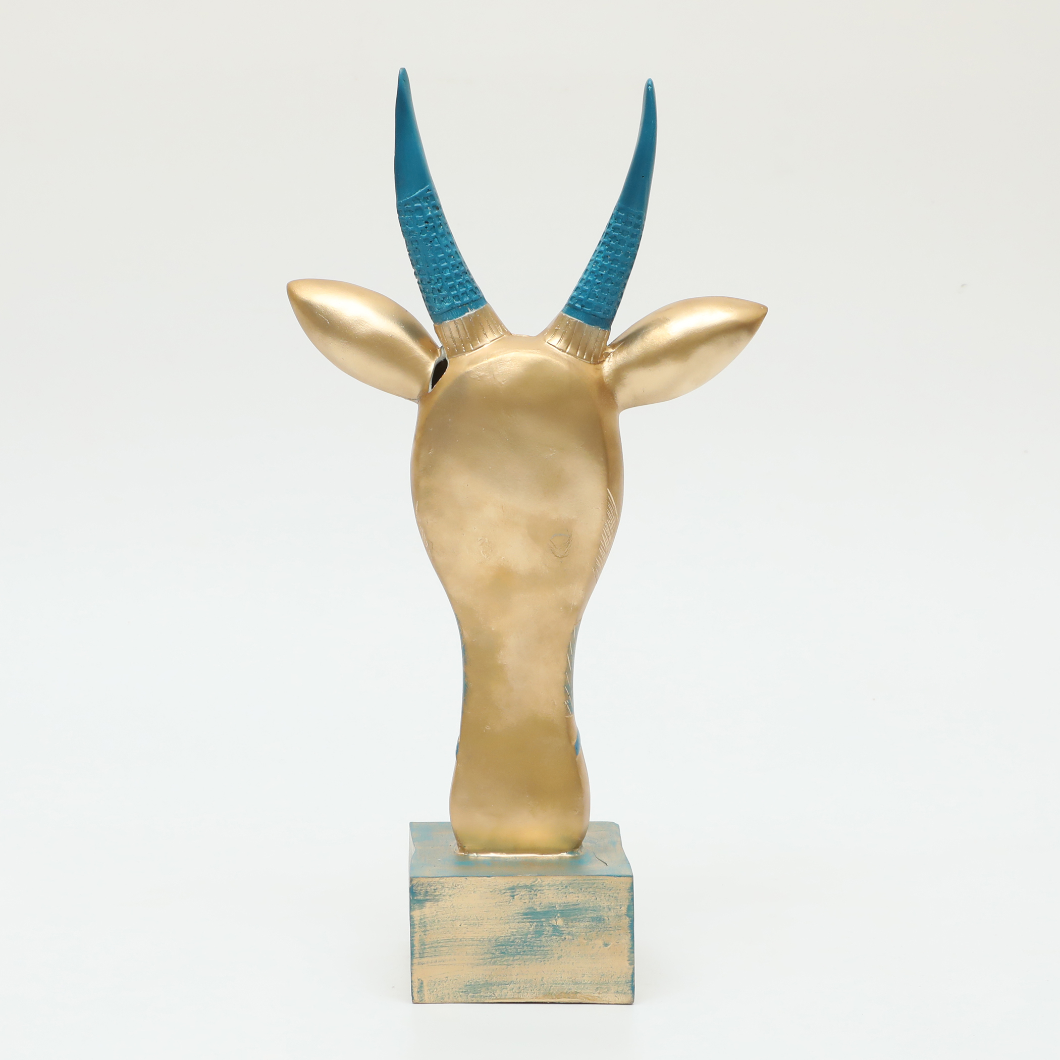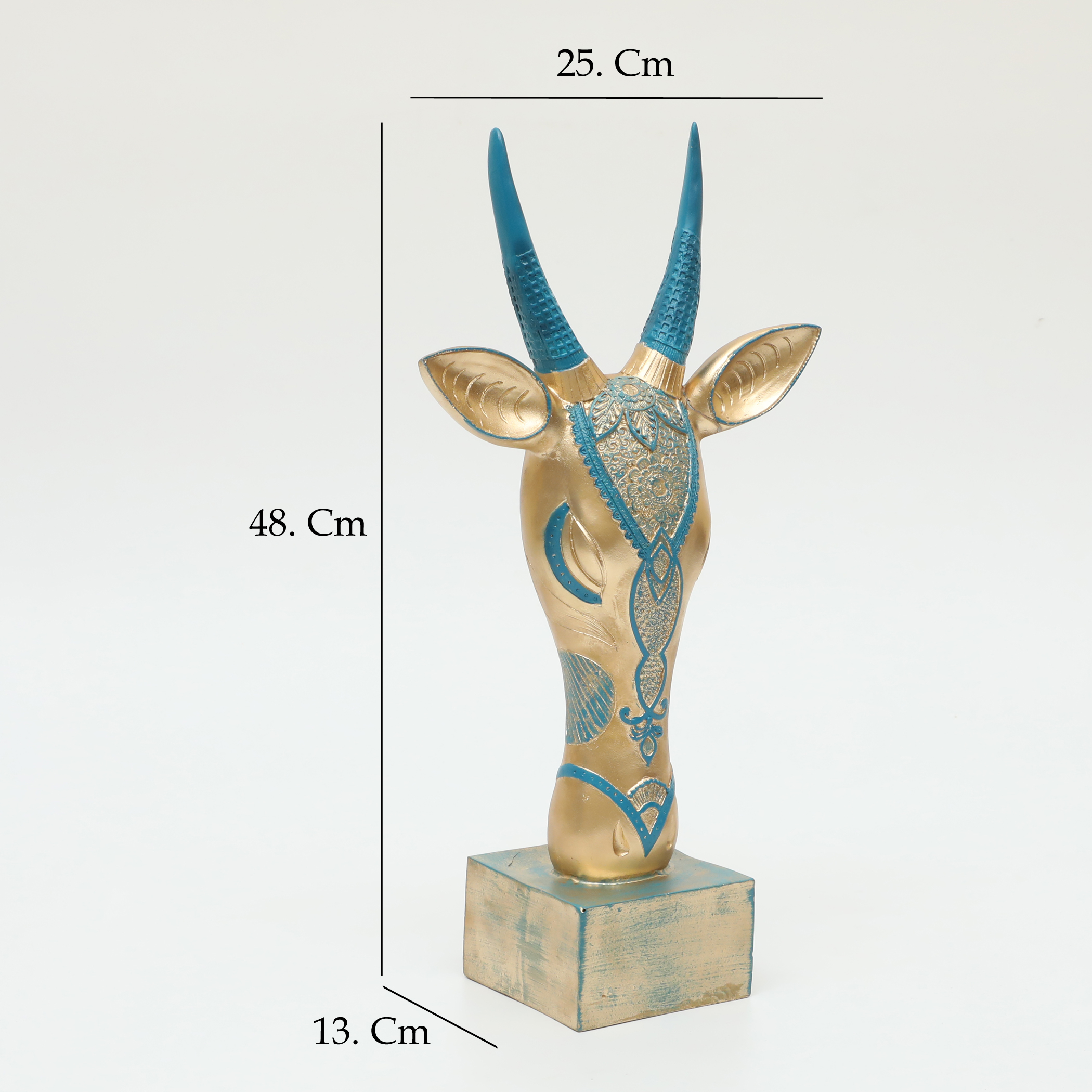 Elevate your home decor with the Vedas Polyresin Yumi Face Animal Figurine, featuring a striking blue goat head adorned with luxurious gold horns. This exquisite sculpture, measuring 25 x 48 cms, serves as a captivating centerpiece that adds a touch of elegance and artistry to any space. Crafted from high-quality polyresin, it combines durability with a stunning design, making it a perfect decorative showpiece for your living room, office, or any area in need of a unique flair. Embrace the charm of this beautiful table decor and transform your surroundings today.