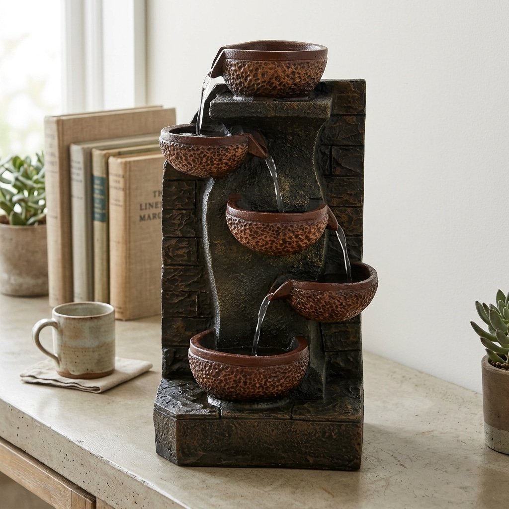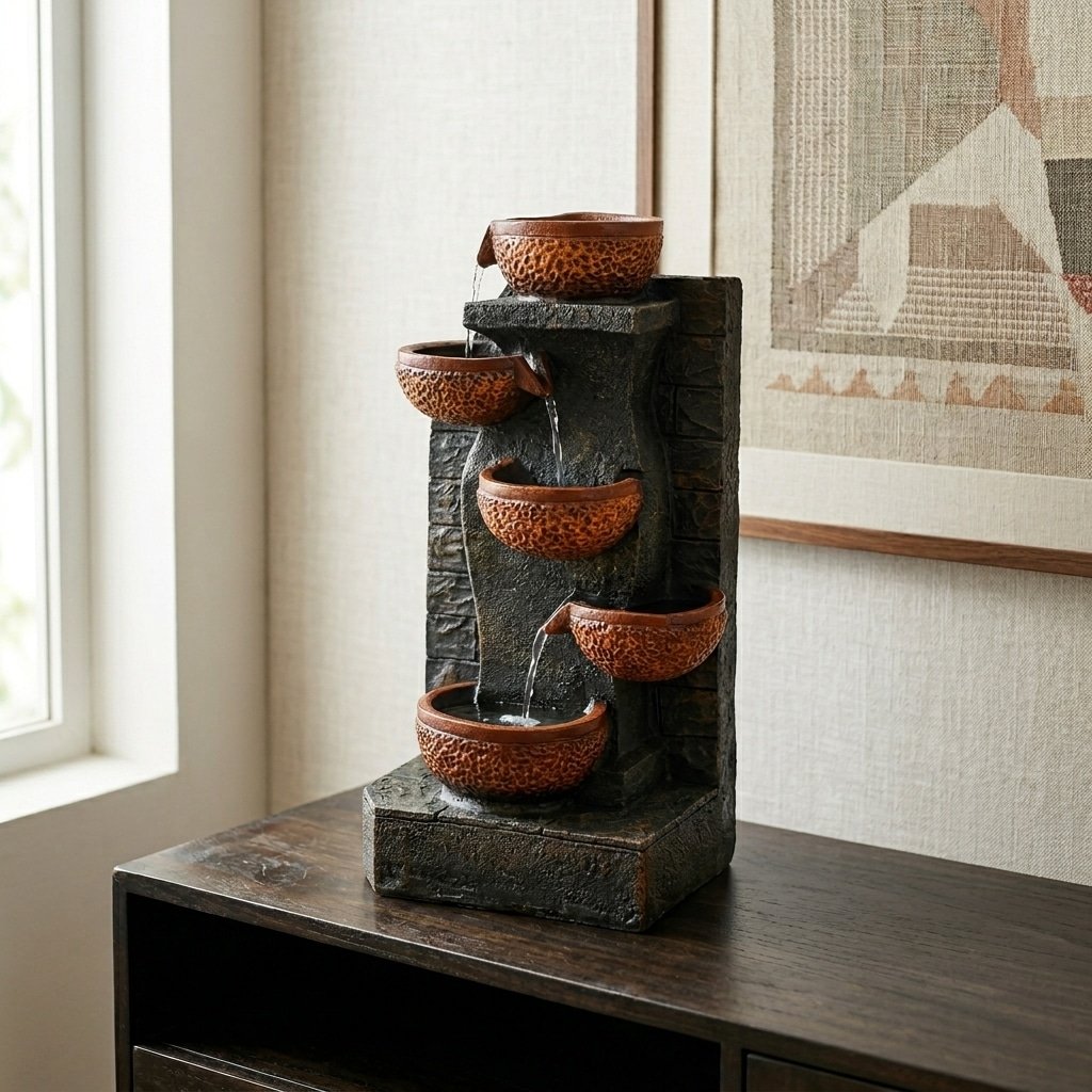 Transform your space into a calming retreat with the Vedas Tabletop Water Fountain. Designed with a beautiful multi-tier cascading bowl structure, this fountain creates a gentle, continuous water flow that soothes the mind and enhances any room’s ambiance.