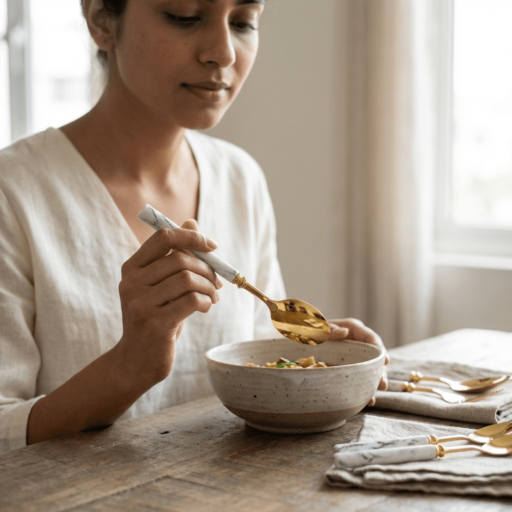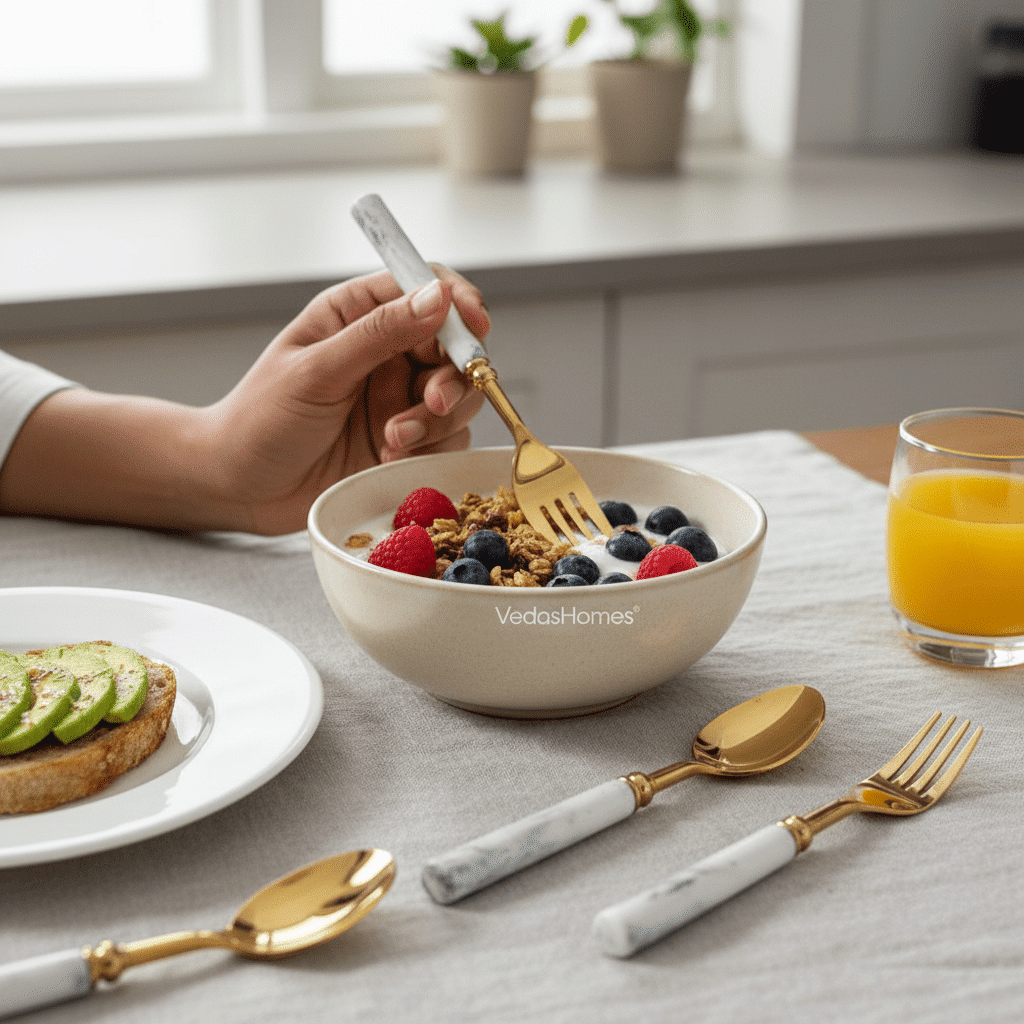 Elevate your dining experience with the Vedas Gold & Marble Cutlery Set of 12, featuring six exquisite gold and white marble forks and spoons. This luxurious set combines elegance and functionality, making it perfect for both everyday meals and special occasions. The stunning gold accents beautifully complement the sophisticated marble design, ensuring your table setting stands out. Crafted for durability and style, this cutlery set is not only a practical addition to your kitchen but also a statement piece that enhances your dining decor. Indulge in the art of fine dining with this exquisite cutlery set.
