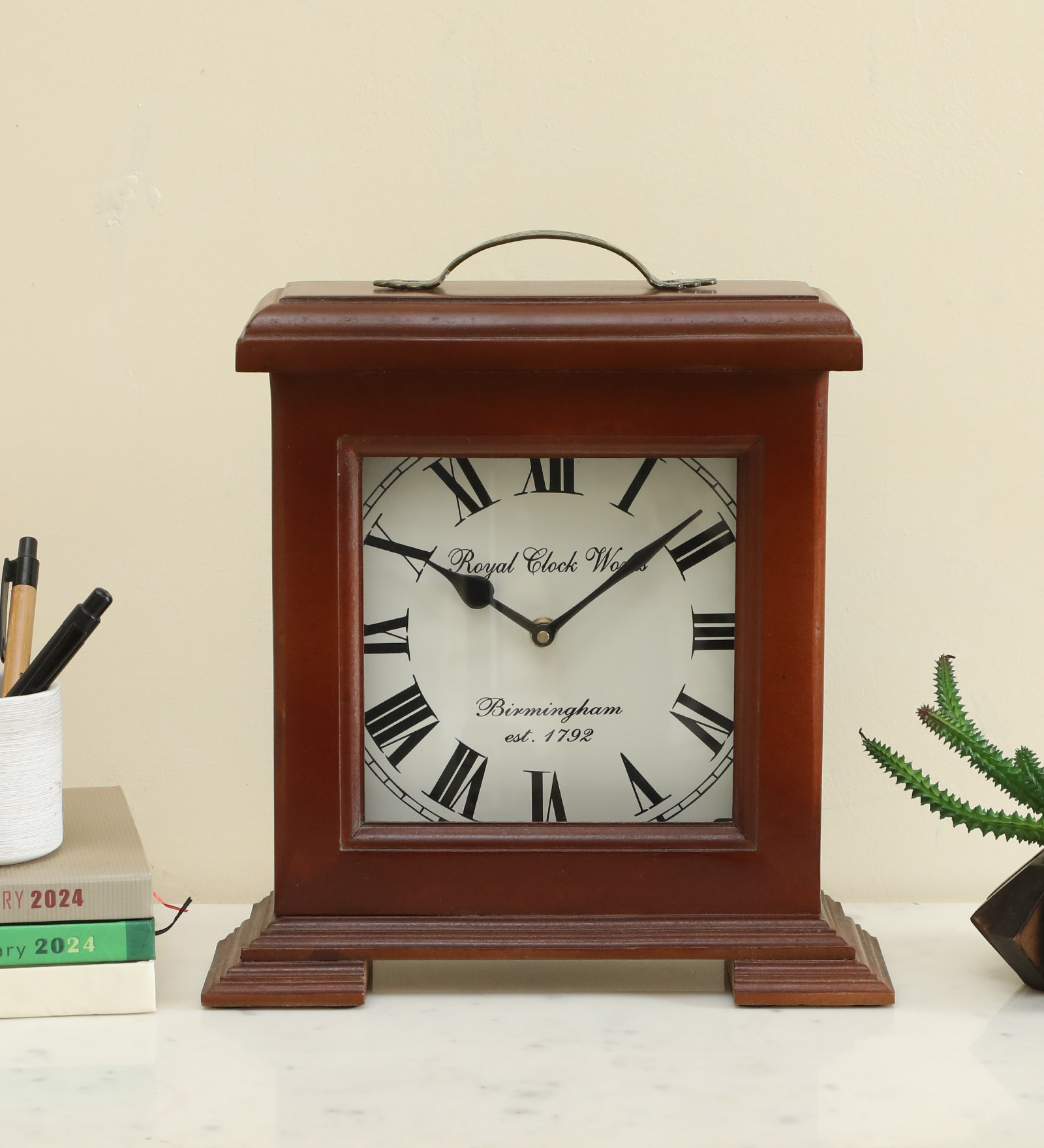 Elevate your home decor with the Yug Wooden Silent Non-Ticking Table Clock, a perfect blend of elegance and functionality. Crafted from high-quality wood, this clock features classic Roman numerals on its face, adding a timeless touch to any room. Its silent operation ensures a peaceful environment, making it ideal for bedrooms, offices, or living spaces. With its sophisticated design and reliable performance, this clock is not just a timepiece but a statement piece that enhances your interior style.