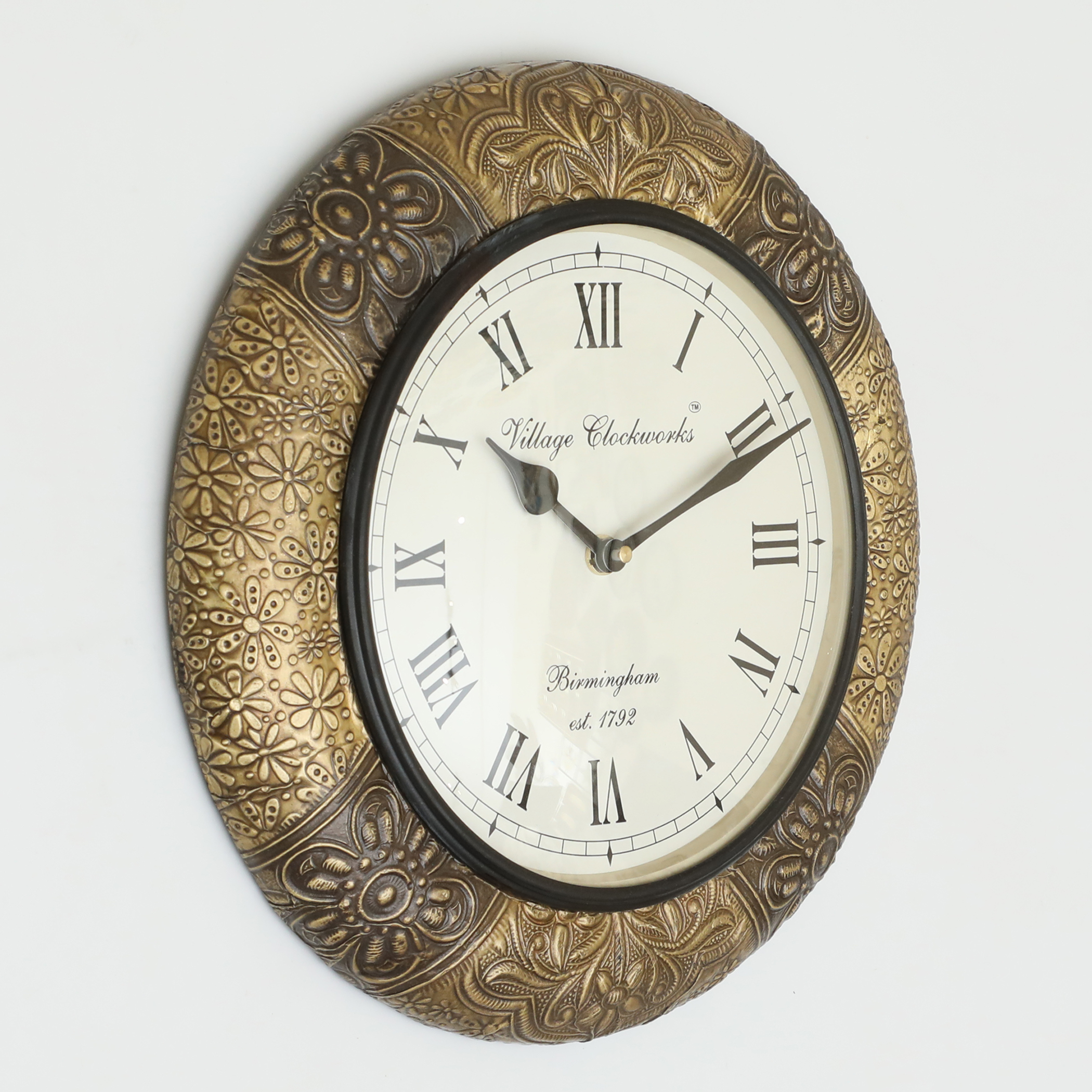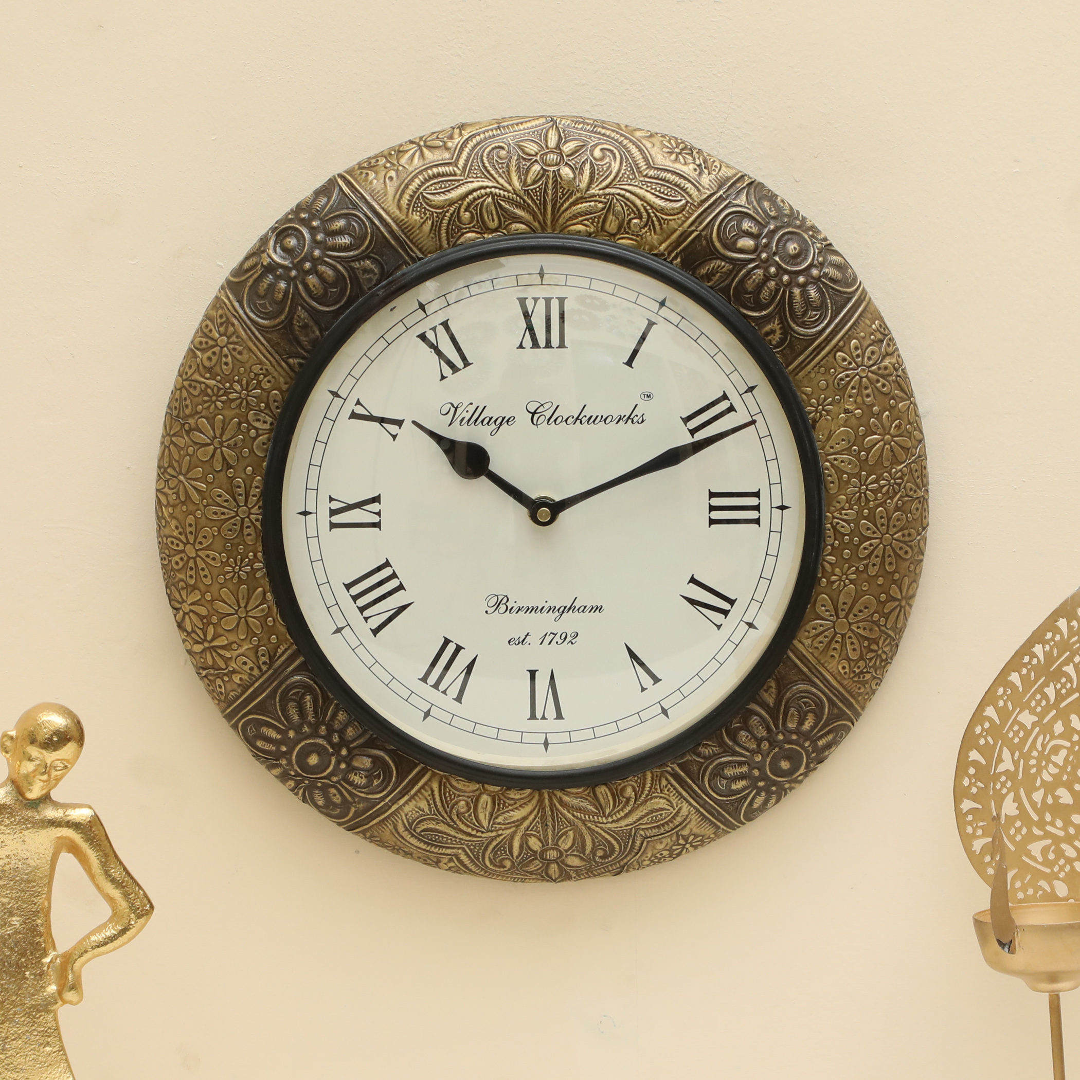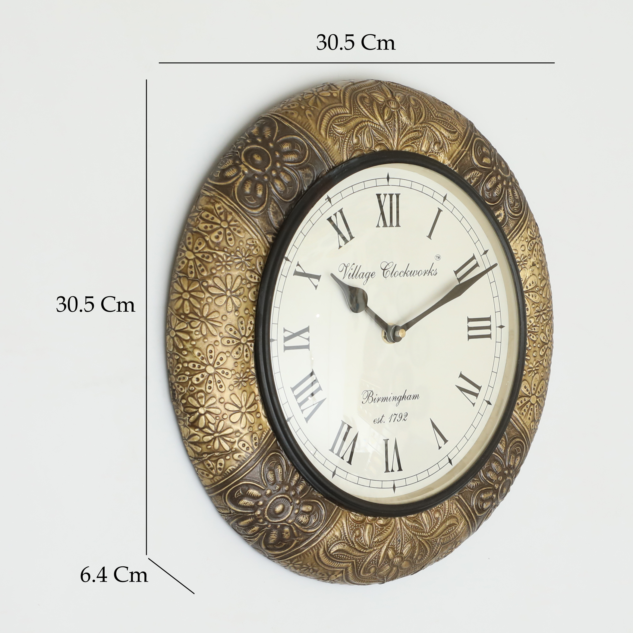 - CLASSIC DESIGN: Elegant wall clock featuring ornate brass-metal frame with intricate floral patterns and heritage-inspired embellishments