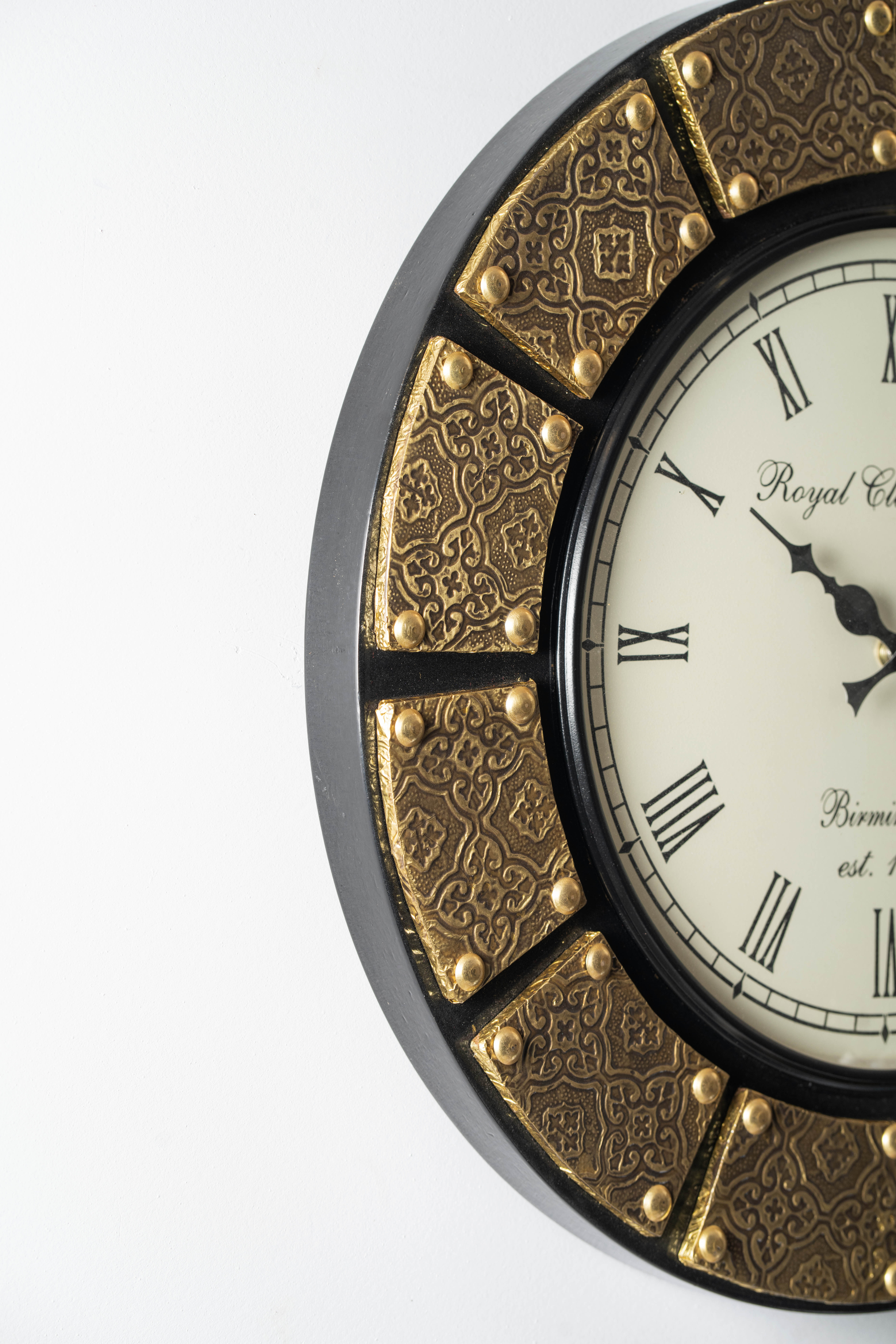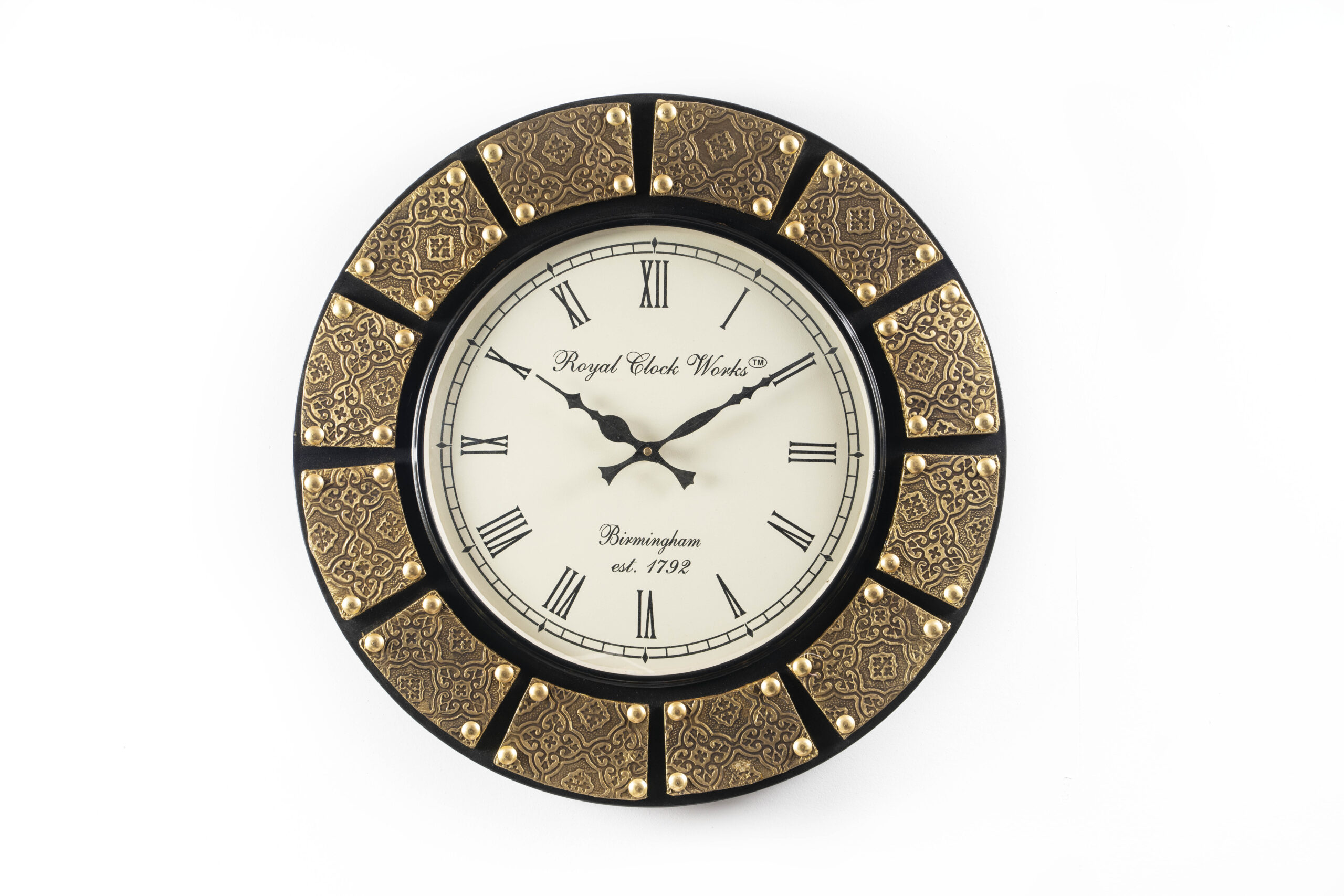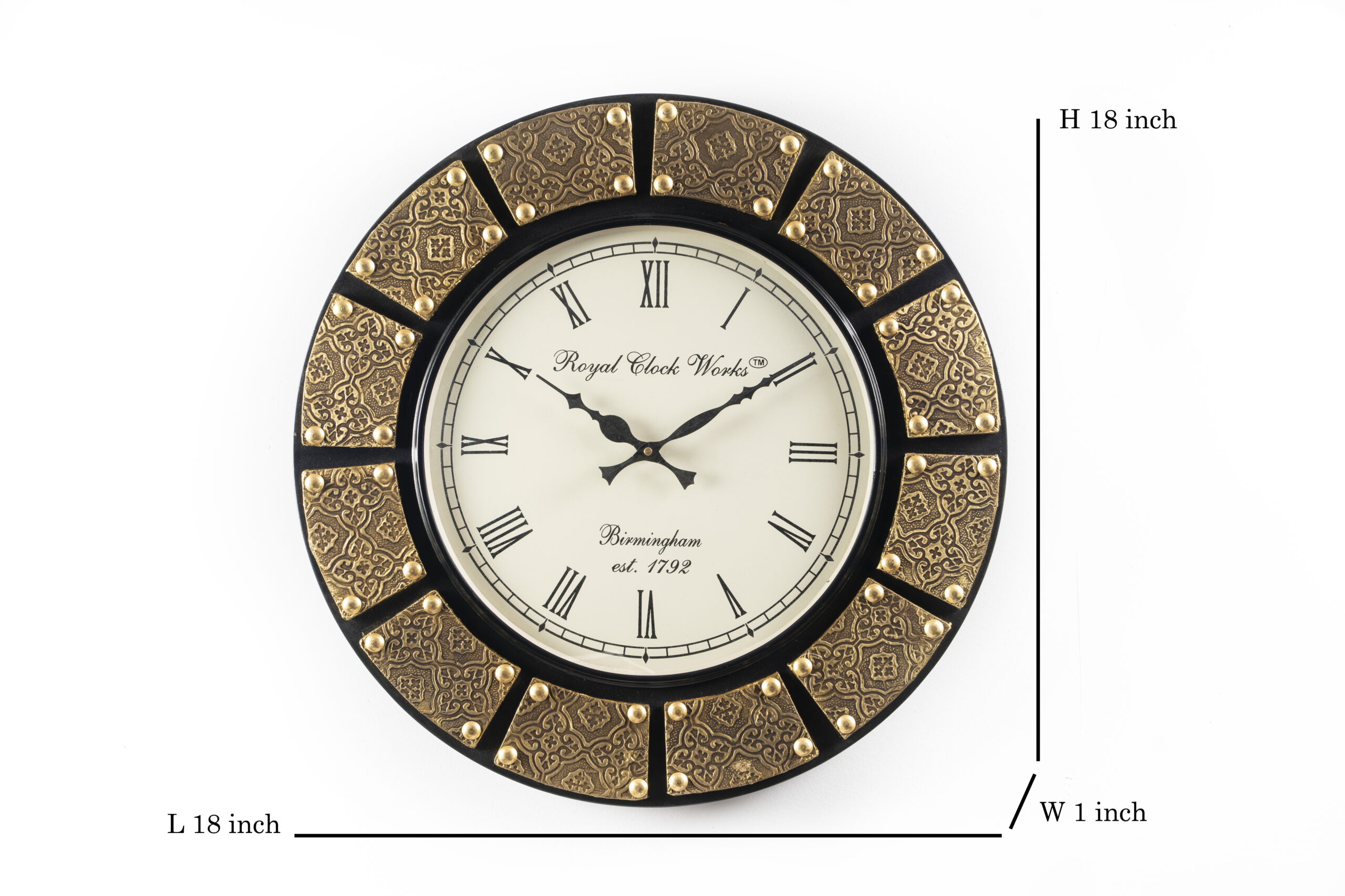 Elevate your home decor with the Zian Wooden Polished and Brass Metal Fit Wall Clock, a stunning 18-inch timepiece that seamlessly blends elegance and functionality. Featuring a striking black and gold color scheme, this clock is adorned with classic Roman numerals that not only enhance its sophisticated aesthetic but also ensure easy readability from a distance. The polished wooden frame adds a touch of warmth and richness, while the brass metal accents provide a luxurious contrast, making it a perfect centerpiece for any room. Whether hung in a living room, office, or hallway, this wall clock serves as both a practical timekeeping device and a statement piece that reflects your refined taste. Invest in this exquisite clock to bring a timeless charm to your space, ensuring that every hour is marked with style.