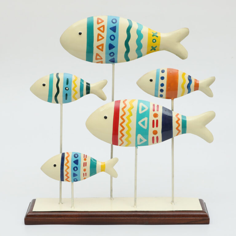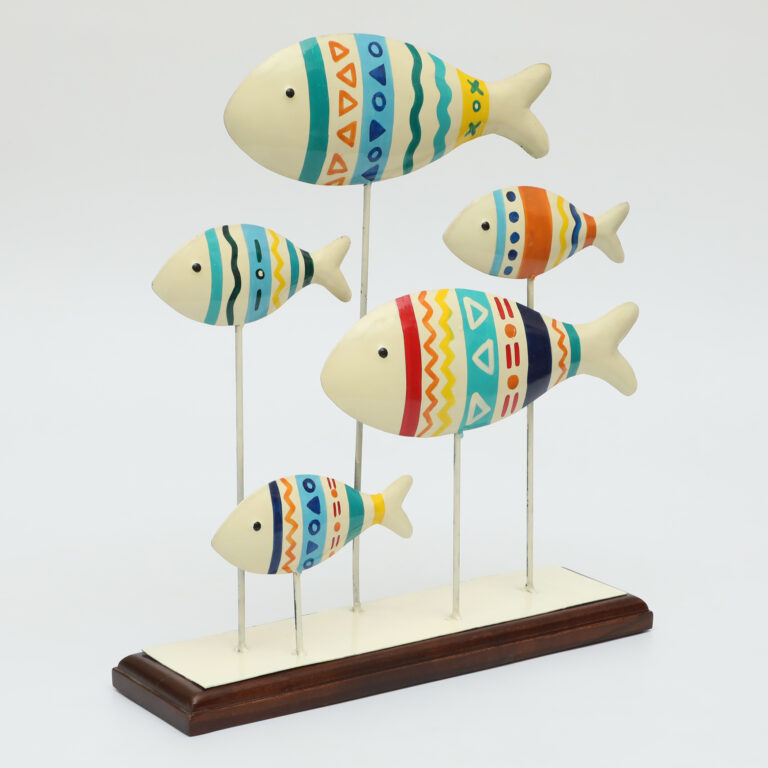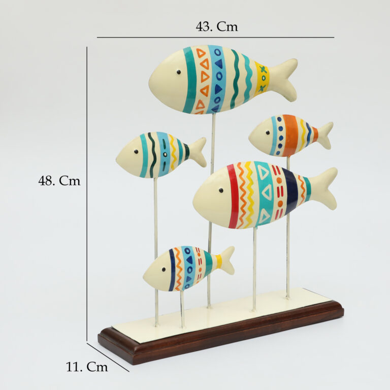 <li class="a-spacing-mini"><span class="a-list-item">DESIGN ELEMENTS: Features five beautifully crafted fish figures in varying sizes, arranged at different heights for visual interest</span></li>